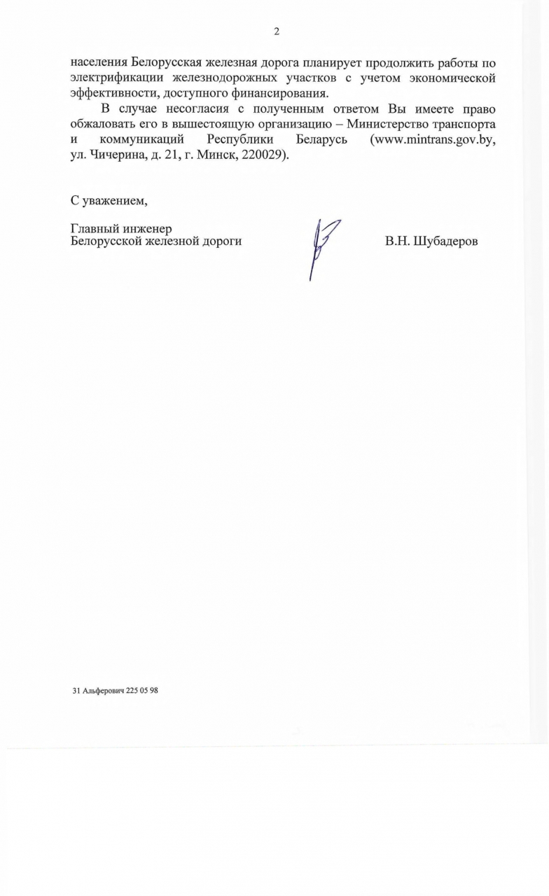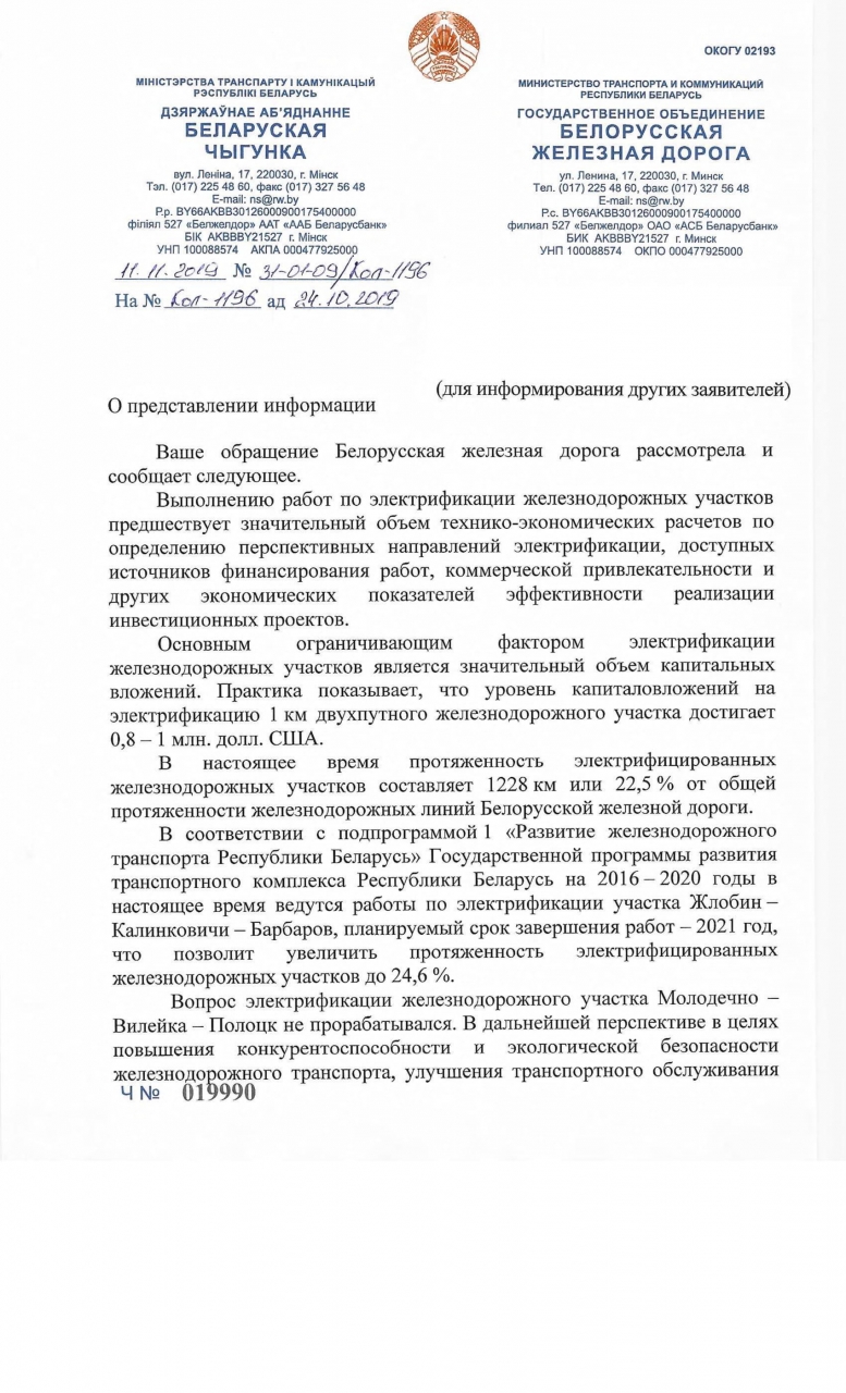 С целью развития экономического потенциала Вилейского района и всего региона, а также для увеличения числа перевозок пассажиров и грузов между городами Вилейка, Молодечно, Сморгонь (ч\з Молодечно), Островец (ч\з Молодечно), Лида (ч\з Молодечно), Минск, их упрощения и удешевления, а также в связи со скорым открытием Белоруской АЭС с большим объемом электроэнергии, во исполнение программы Президента по развитию экологического электротранспорта просим Вас электрифицировать участок железной дороги между городами Молодечно и Вилейка, с возможностью последующей электрификации до города Полоцк.