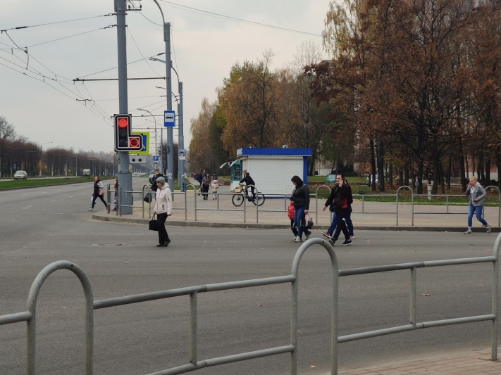 На перекрёстке ул. Лазаренко и ул. Космонавтов в Могилёве установлен светофор. Зелёная фаза одновременно распространяется на все участки пешеходного перехода. При этом пересекать дорогу по диагонали запрещено. Интервал между зелёными фазами составляет 140 секунд. Таким образом, чтобы пересечь перекрёсток (со стороны рынка к остановке), по правилам нужно затратить не менее 280 секунд, не считая двух зелёных фаз. Это неудобное решение вынуждает пешеходов пересекать дорогу по диагонали с нарушением правил. Город должен быть удобен, по нашему мнению, в первую очередь для пешеходов, а затем для водителей.