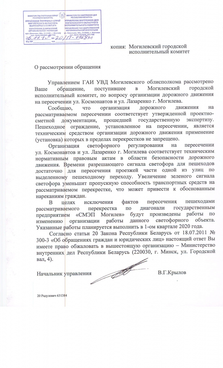 ГП "СМЭП Могилёв" будут произведены работы по изменению работы светофорного объекта, планируемый срок работ 1-й кварта 2020 г.