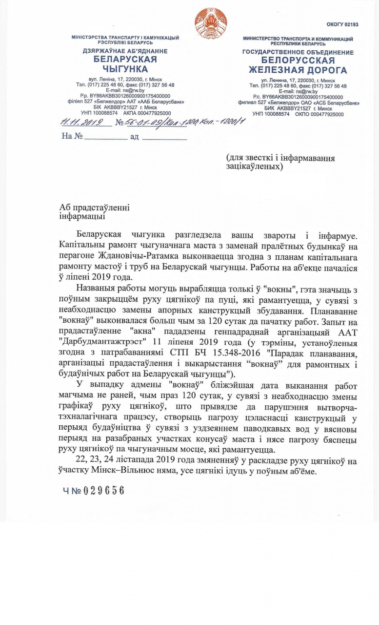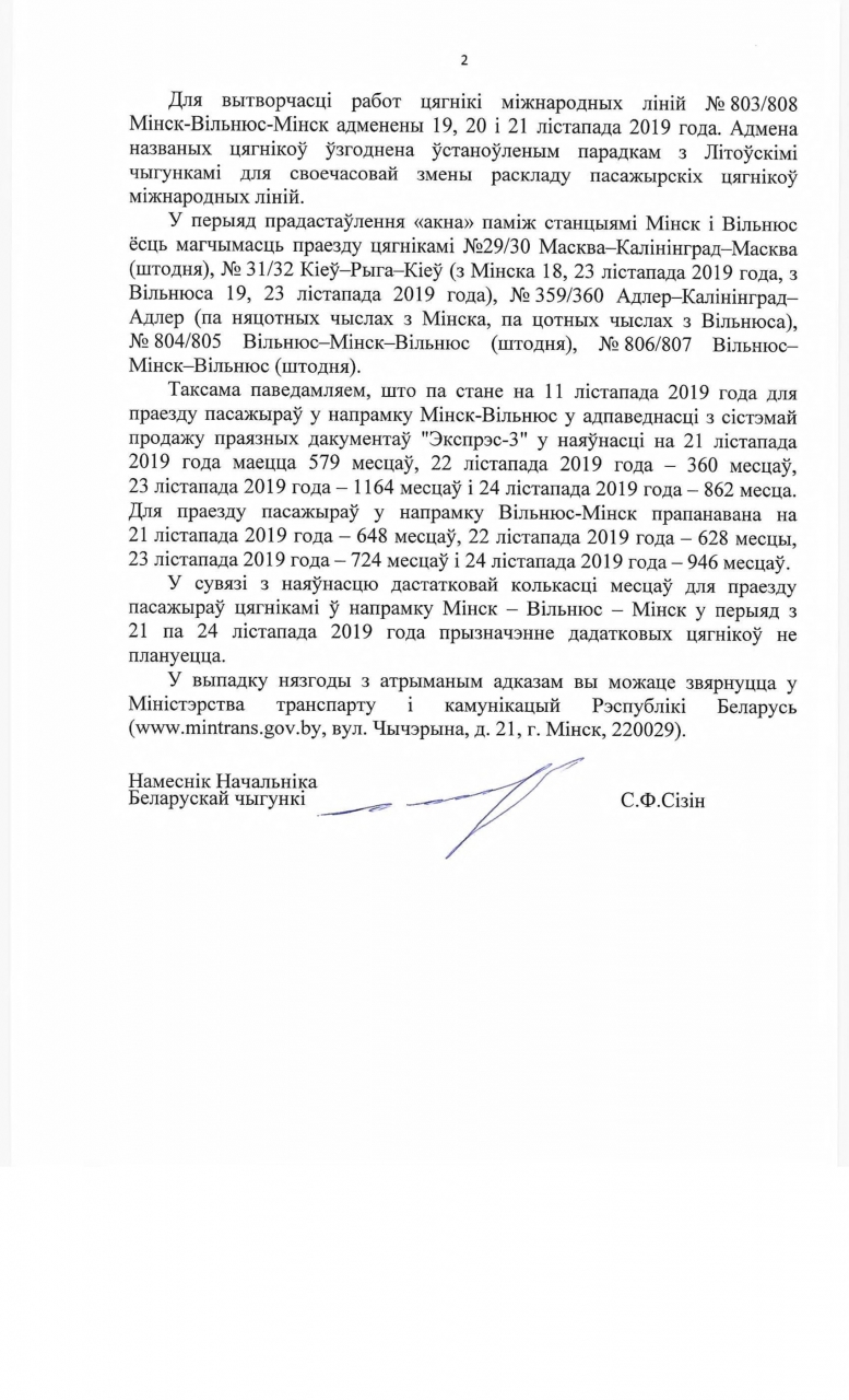 23, 24 і 25 лістапада 2019 г. змяненняў у раскладзе руху цягнікоў на ўчастку Мінск-Вільнюс няма. 21 лістапада 2019 г. ёсць магчымасць праезду іншымі цягнкамі. У сувязі з наяўнасцю дастатковай колькасці месцаў для праезду пасажыраў цягнікамі ў напрамку Мінск-Вільнюс-Мінск прызначэнне дадатковых цягнікоў не плануецца.