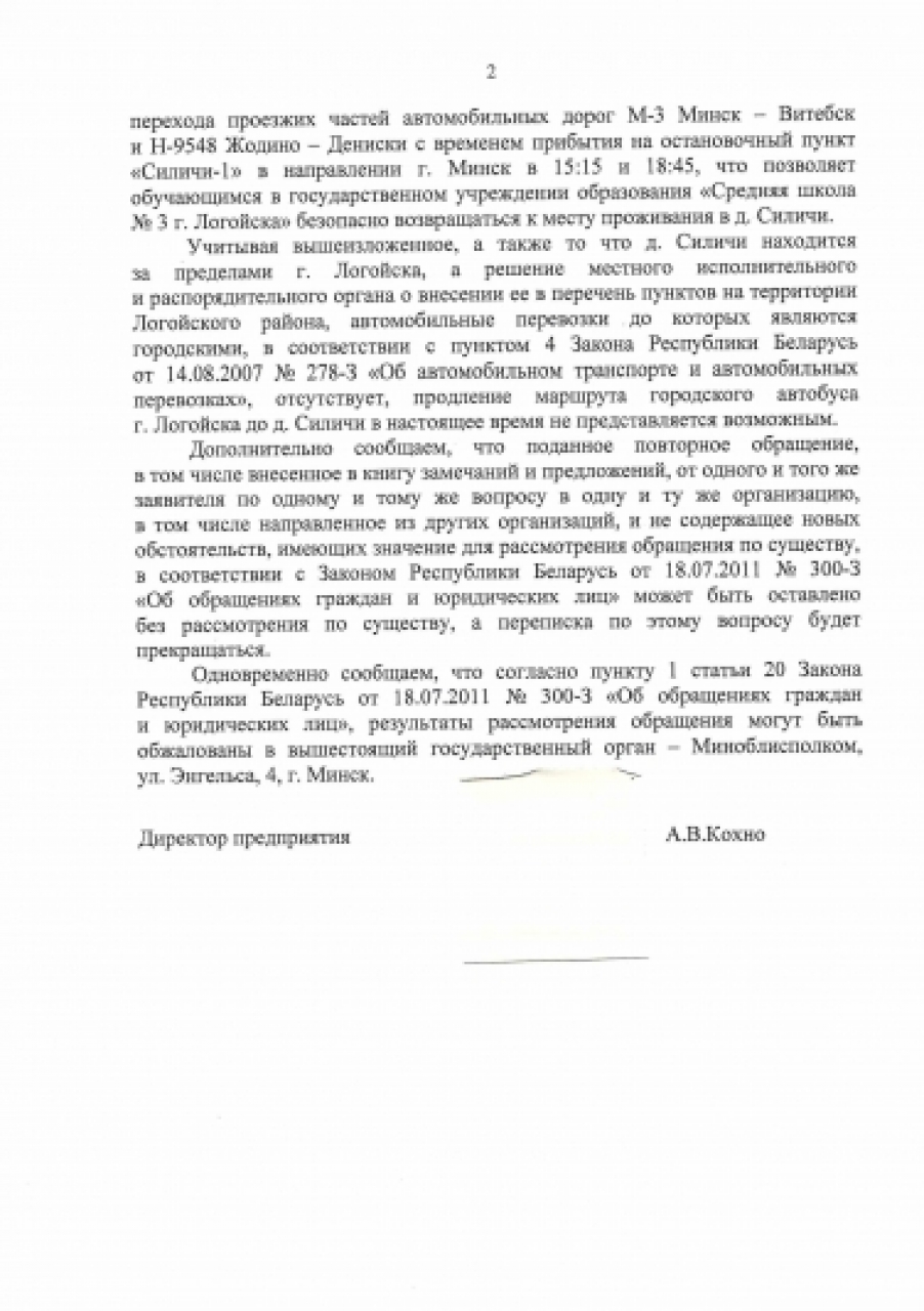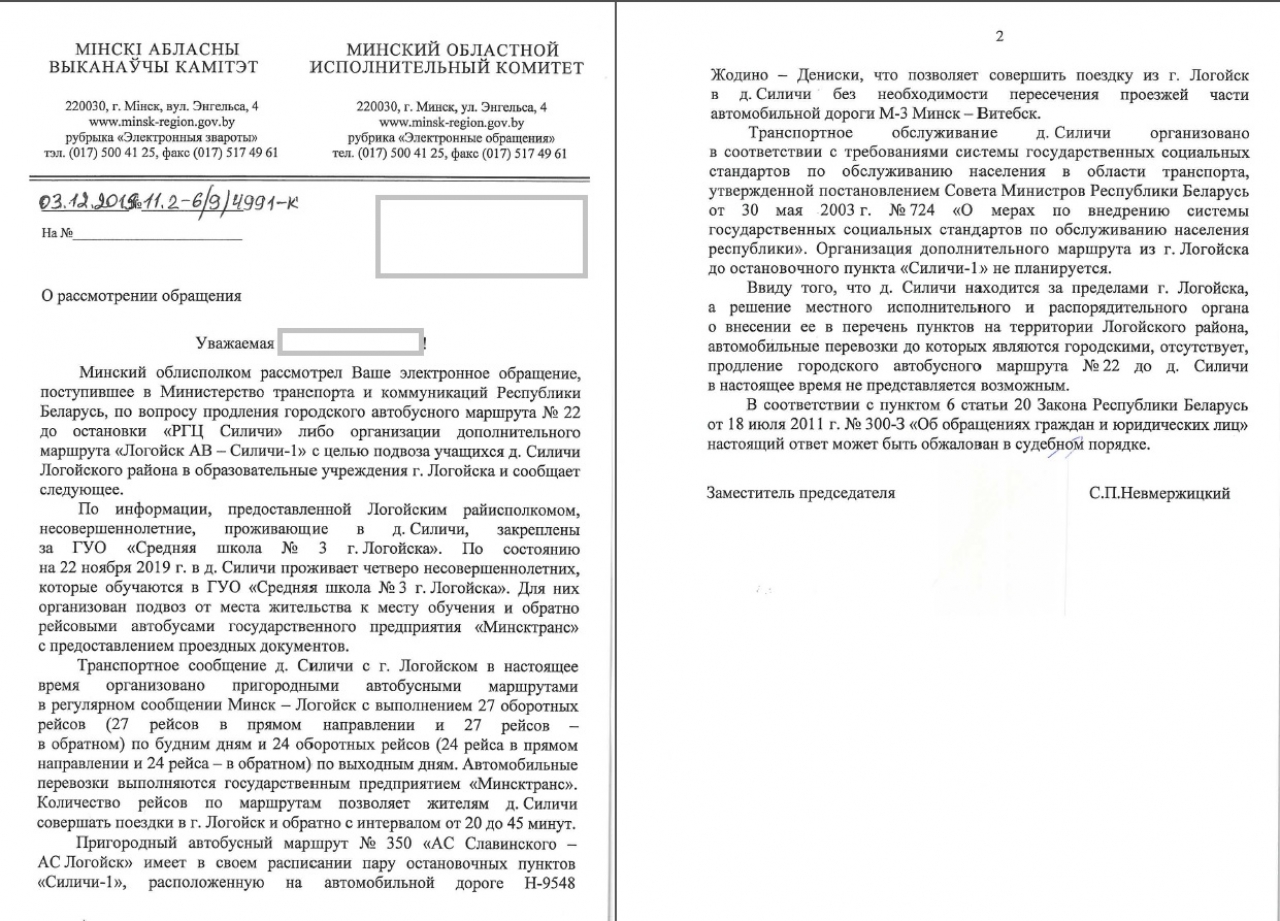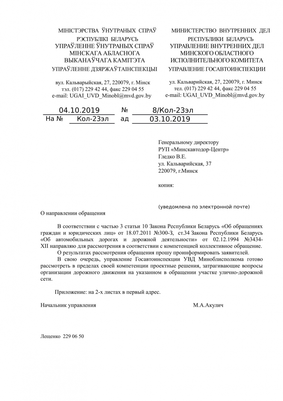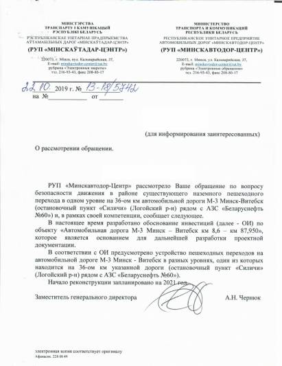 06 октября 2019 мною получен ответ на электронное обращение об организации подземного (надземного) пешеходного перехода на автодороге М-3 Минск-Витебск в районе остановочного пункта «Силичи» (Логойский р-н) (копия ответа прилагается). Указанный ответ я считаю не соответствующим требованиям законодательства в части полного, всестороннего и объективного рассмотрения обращений и направления мотивированных и обоснованных ответов гражданам по следующим причинам: