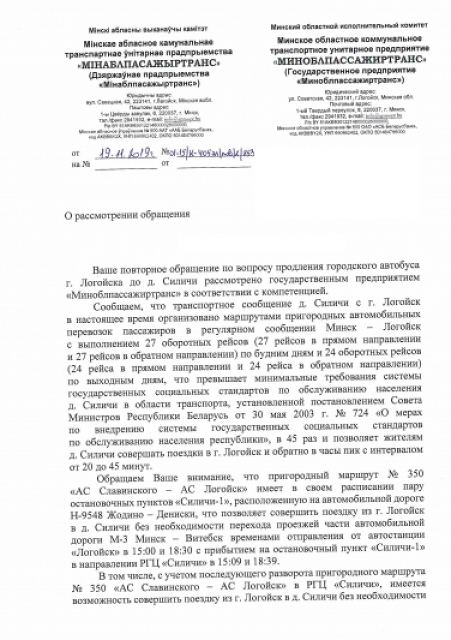Либо организовать дополнительный маршрут из г.Логойска до остановки «Силичи 1» (Н-9548 Жодино - Дениски) и в обратном направлении с интервалом движения 20-30 минут ежедневно.