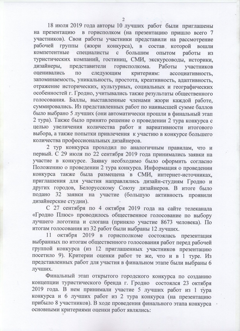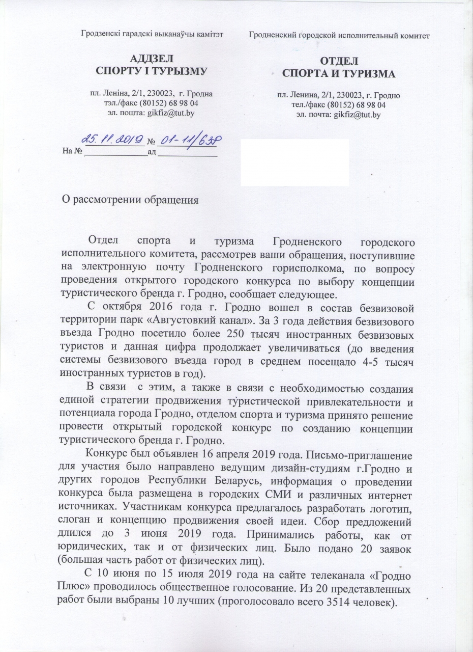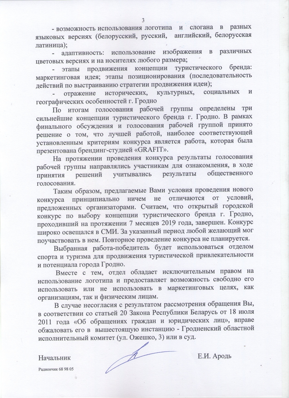 Предлагаемые в обращении предложения проведения нового конкурса принципиально не отличаются от условий, предложенных организаторами. Открытый городской конкурс по выбору концепции туристического бренда Гродно завершён, повторное проведение конкурса не планируется.