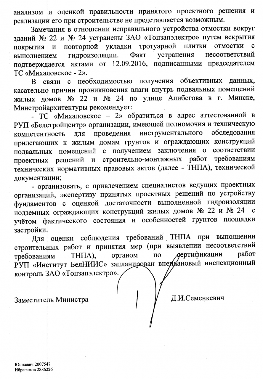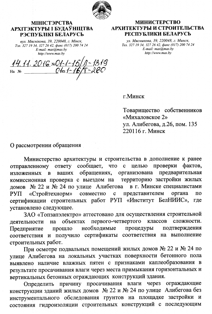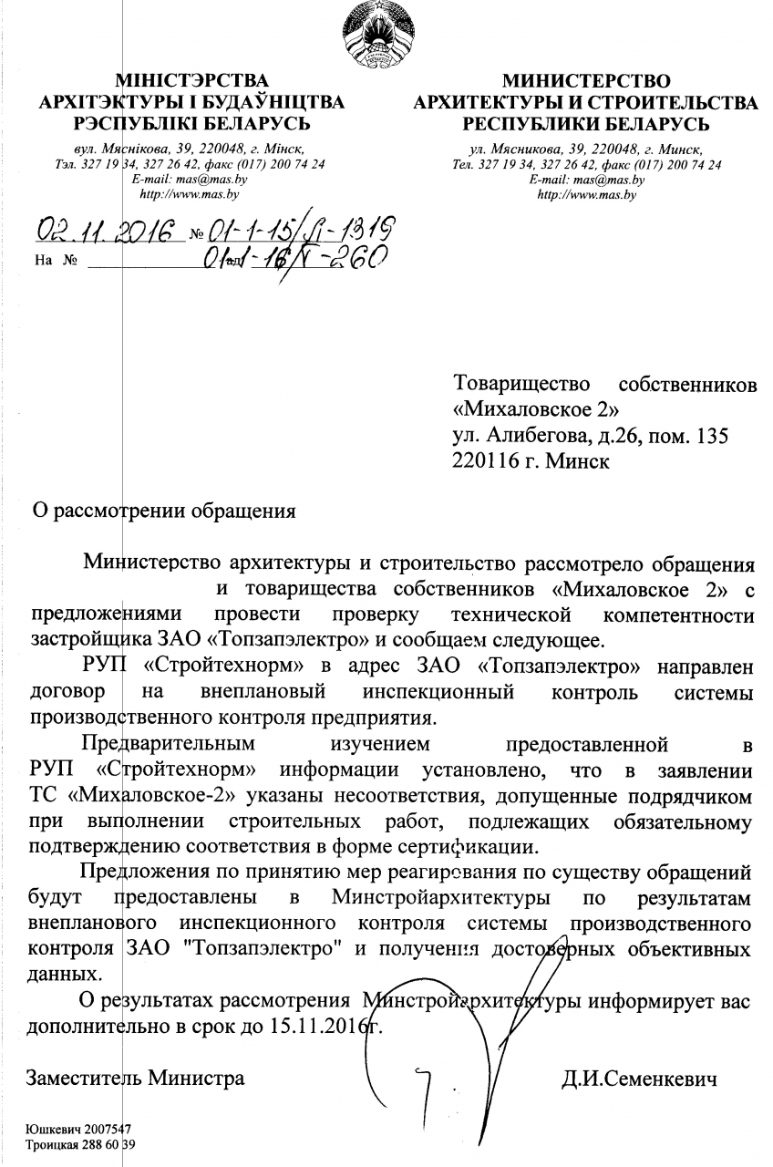 В связи с низким качеством строительных работ, учитывая, что Указом Президента Республики Беларусь № 498 "О дополнительных мерах по работе с обращениями граждан и юридических лиц" Министерство архитектуры и строительства определено в качестве органа, осуществляющего контроль в сфере строительства, а также в вопросах выдачи строительной и иной разрешительной документации в сфере архитектуры, градостроительства и строительства, а функции по государственному строительному надзору в целях обеспечения эксплуатационной надежности и безопасности объектов строительства, соблюдения установленного порядка строительства объектов, государственной защиты интересов потребителей строительной продукции и общества в соответствии с Законом Республики Беларусь "Об архитектурной, градостроительной и строительной деятельности в Республике Беларусь" осуществляет Департамент контроля и надзора за строительством Государственного комитета по стандартизации, ПРОСИМ инициировать оценку технической компетентности застройщика ЗАО "Топзапэлектро".