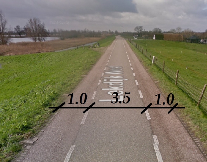 Проезжая часть состоит из одной полосы движения, используемой в обоих направлениях, и двух односторонних полос для движения велосипедистов. Для встречного разъезда автомобили могут съезжать на велосипедную часть проезжей части. На велосипедной части велосипедисты имеют преимущество. Приблизительные размеры полос указаны на прилагаемом рисунке, ширина полос может быть увеличена, а также может присутствовать обочина.