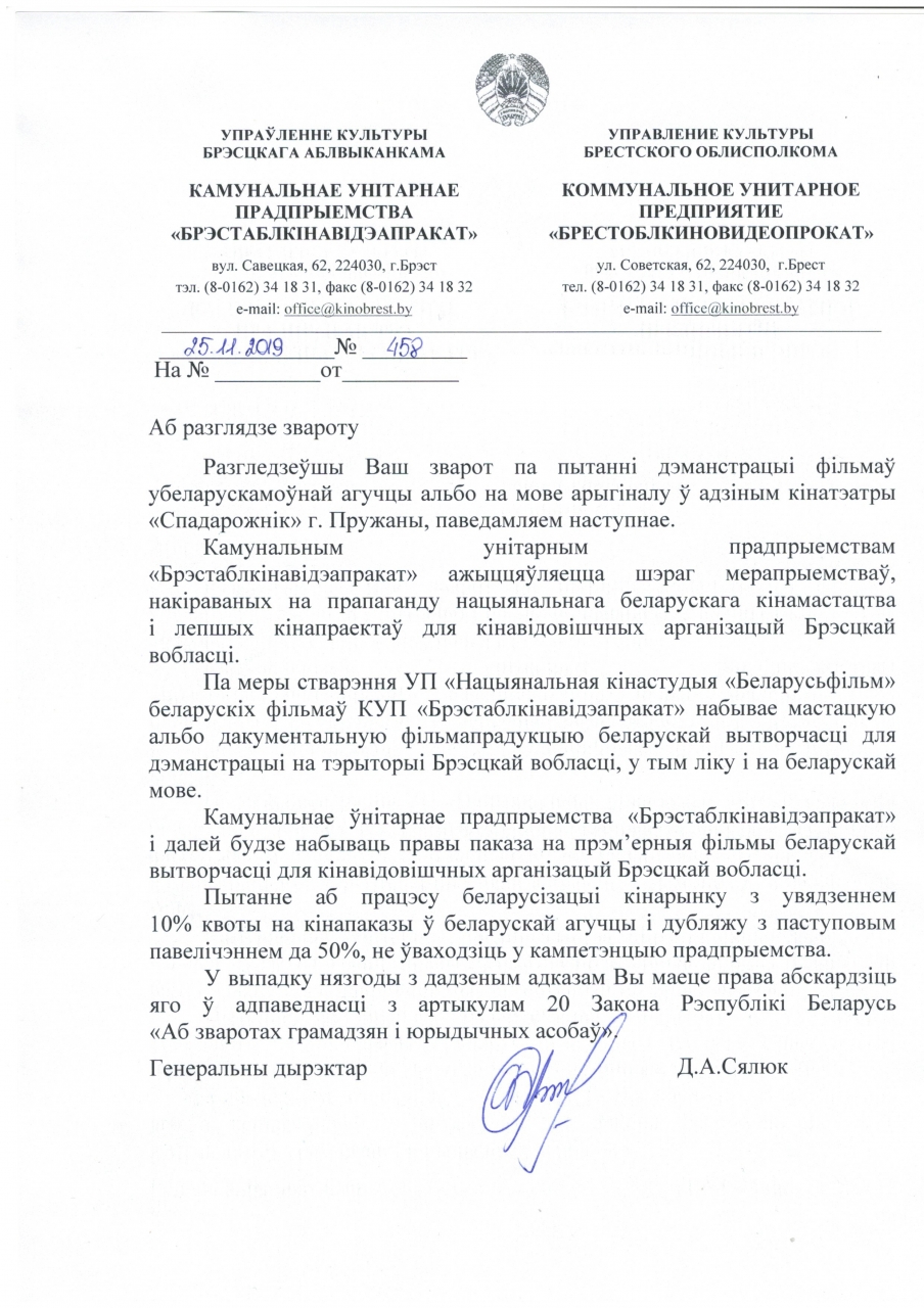 КУП “Брэстаблкшавщэапракат” ажыццяўляецца шэраг мерапрыемстваў, накіраваных на прапаганду нацыянальнага беларускага кінамастацтва i лепшых кінапраектаў, для кінавідовішчных арганізацый Брэсцкай вобласці.