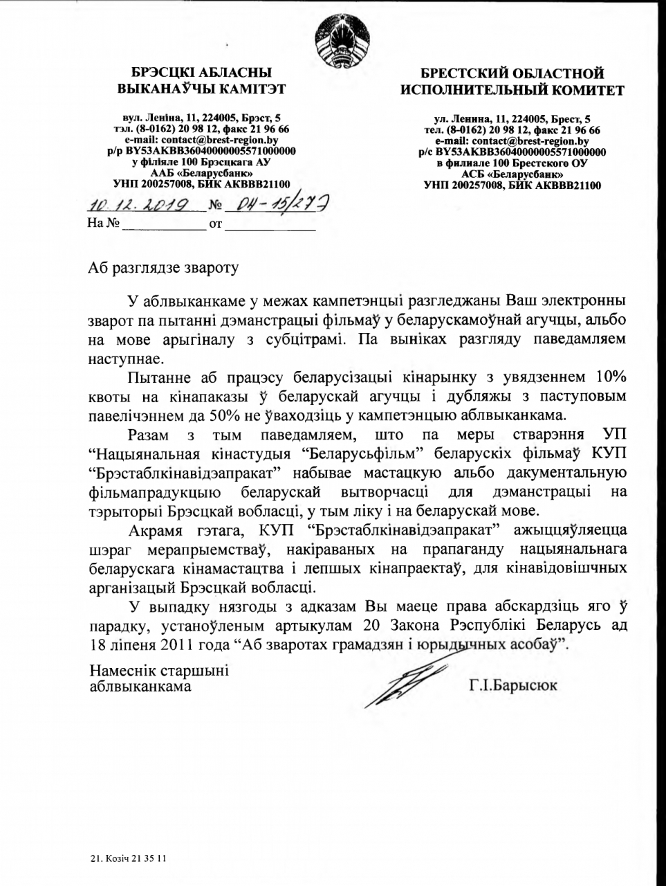 Таксама прапаноўваем у рамках кампетэнцыі пачаць працэс беларусізацыі кінарынку з увядзення 10% квоты на кінапаказы ў беларускай агучцы і дубляжы з паступовым павелічэнням да 50% (што было б справядліва, улічваючы раўнапраўны статус дзяржаўных моў).