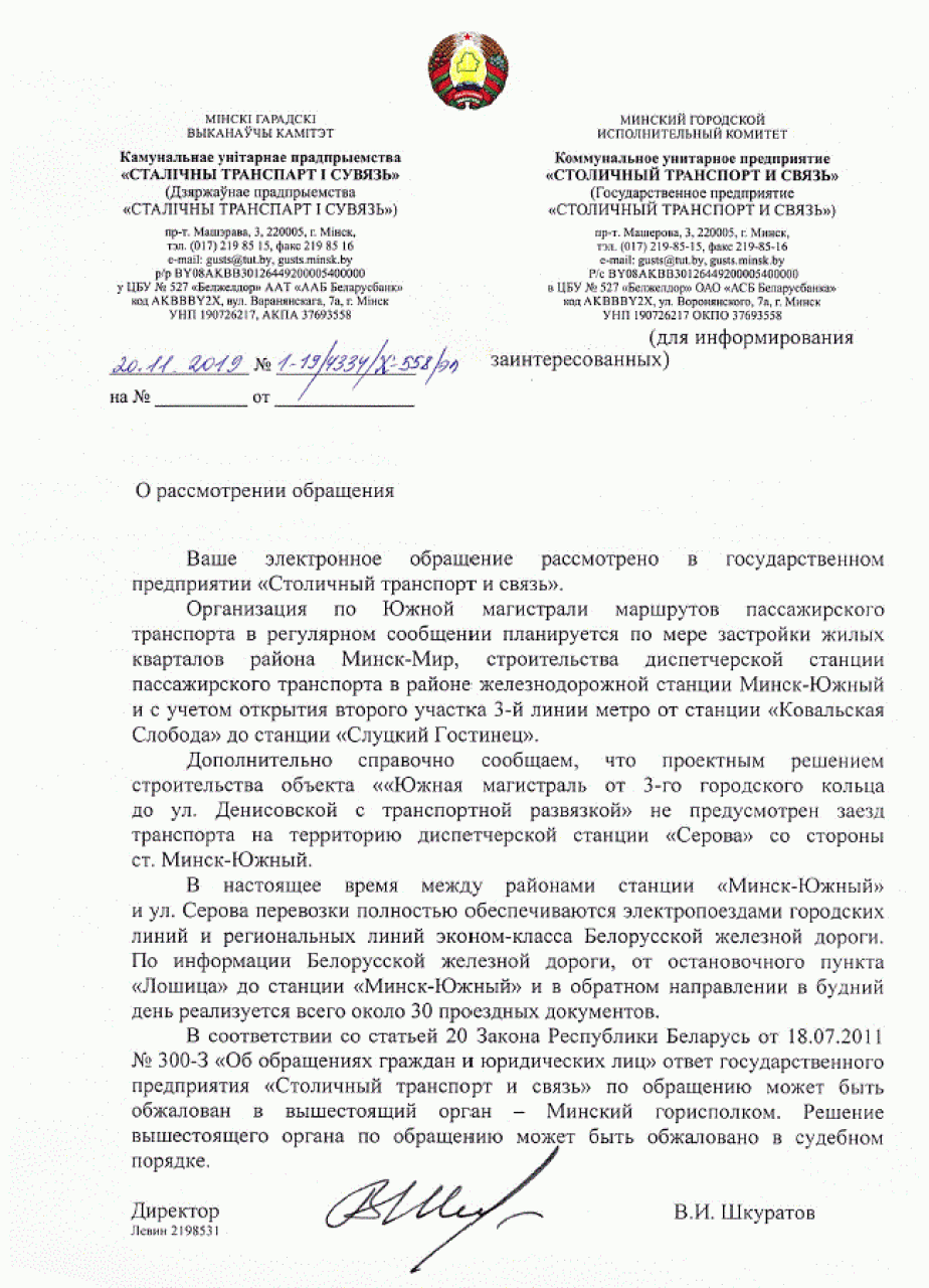 Организация по Южной магистрали маршрутов пассажирского транспорта в регулярном сообщении планируется по мере застройки жилых кварталов района "Минск-Мир", строительства диспетчерской тсанции в районе ж/д станции "Минск-Южный" и с учётом открытия второго участка 3-й линии метро от станции "Ковальская Слобода" до станции "Слуцкий Гостинец".