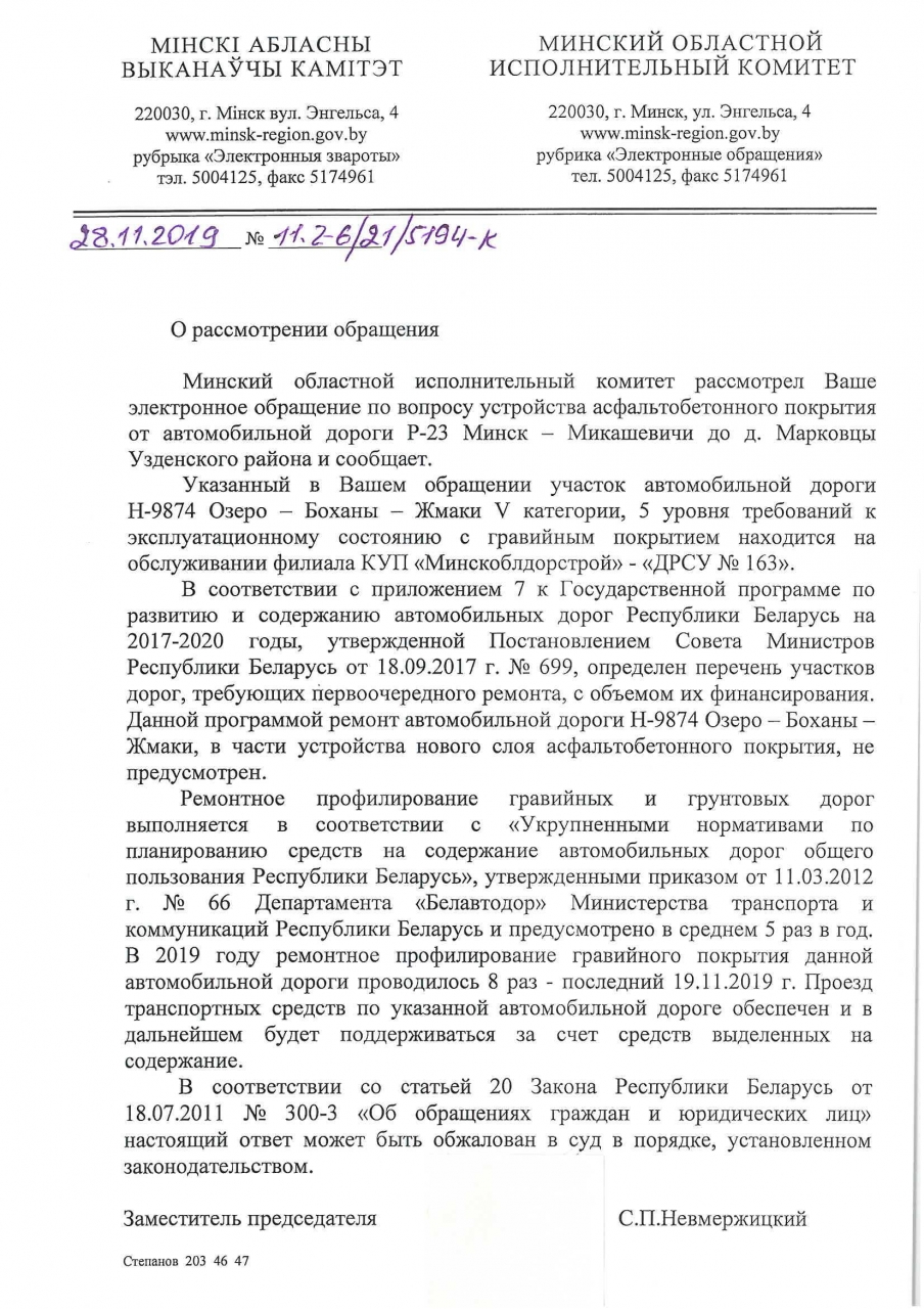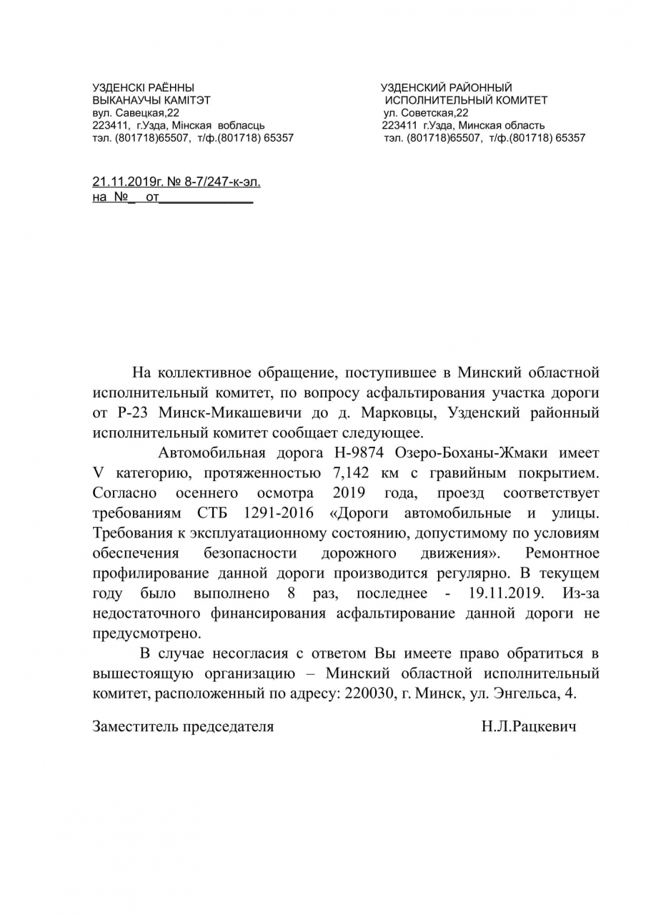 Таким образом, просим принять меры по асфальтированию дорожного покрытия на участке дороги от автотрассы P-23 Минск-Микашевичи до дер.Марковцы.