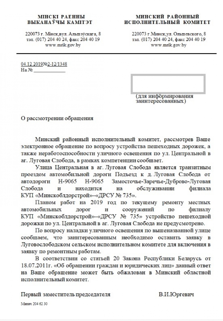 обустроить пешеходную дорожку и наладить работу освещения на протяжении всей улицы Центральной в агрогородке Луговая слобода, для повышения безопасности передвижения местных жителей, в том числе в тёмное время суток.