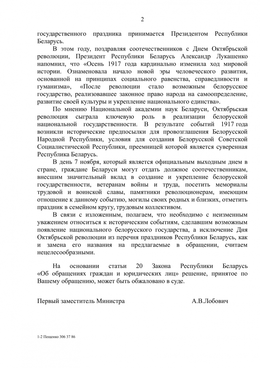 Надо наконец признать, что консервируя эту дату как государственный праздник, Беларусь застряла во времени. Уже три года назад российские СМИ не без иронии¹ говорили об этом. В прошлом году А. Лукашенко подтвердил², что день надо наполнить каким-то другим смыслом, т.к. он отмечается по привычке. Мы считаем, пора — 102-я годовщина Октябрьской революции должна быть в Беларуси последней.