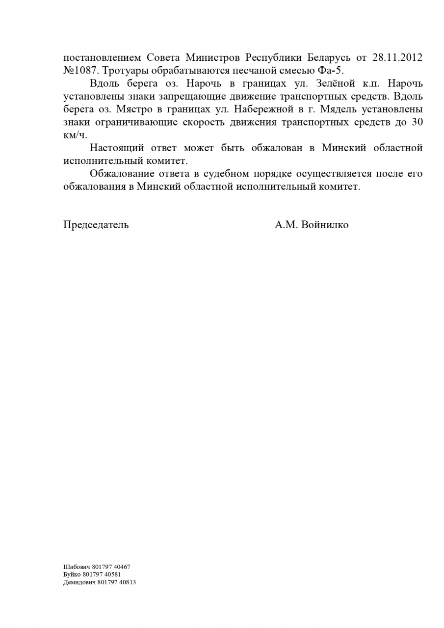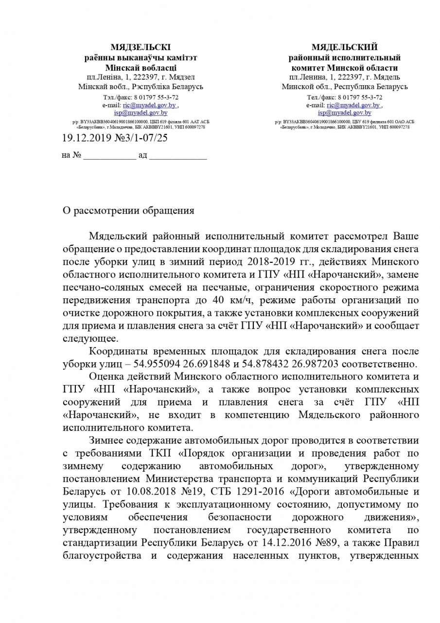 В связи с отсутствием ответа РИК г.Мядель, отстранения от решения вопросов Минского Облисполкома (переадресация в Минский Комитет природных ресурсов), ответам Министерства и Минского областного комитета природных ресурсов и охраны окружающей среды, ответа нацпарка «Нарочанский» о отсутствии за 20 лет существования нацпарка предусмотренных мест для складирования снега, просим повлиять на решение следующих вопросов и предложений, как ранее было предложено на собраниях общественности нашего района: