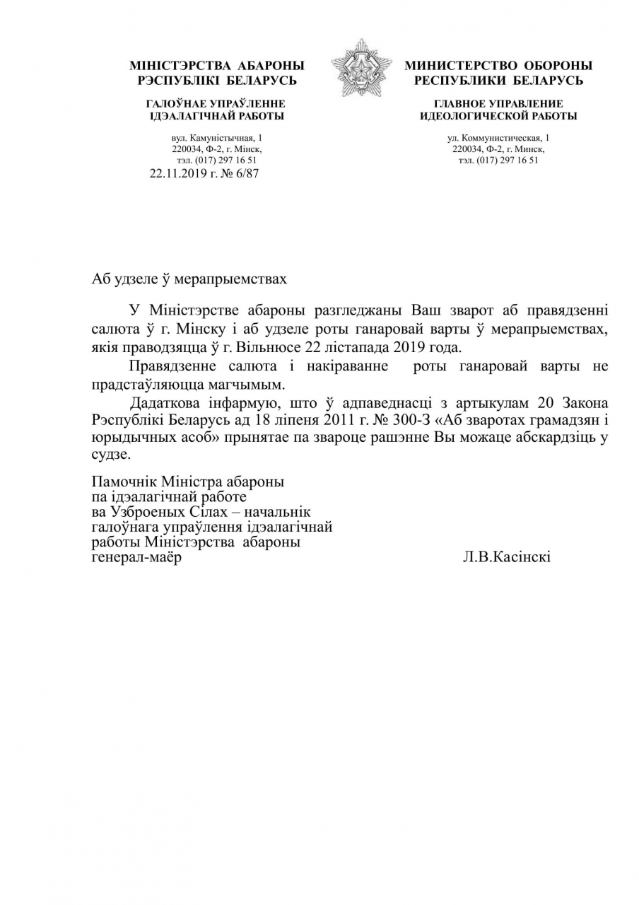 Таксама просім прапапрацаваць з літоўскім бокам удзел роты ганаровай варты ў цырымоніі перанясення парэшткаў на могілкі. Беларусь мусіць паказаць свету і сваім грамадзянам, што ў ёй высока шануюць тых, хто стаіць за яе незалежнасць, нават перад асобай шматкроць пераўзыходнага ворага.