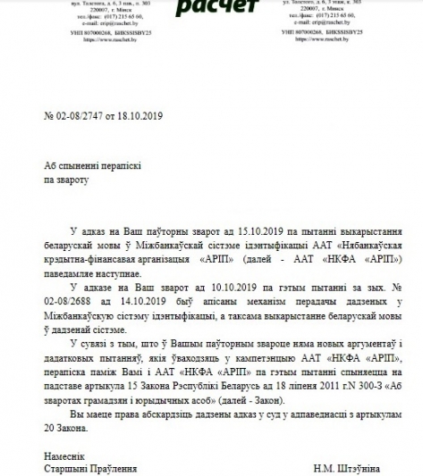 У адказе на наступны зварот (№ 02-08/2747 ад 18.10.2019) сп. Штэўніна заявіла аб спыненні перапіскі ў сувязі з тым, што ў наступным звароце “няма новых аргументаў і дадатковых пытанняў, якія ўваходзяць у кампетэнцыю АРІП”. У тым наступным звароце прыводзіліся канкрэтныя вытрымкі з закону “Аб мовах”, які ніяк не згадваўся ў першым адказе сп. Штэўнінай: