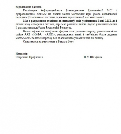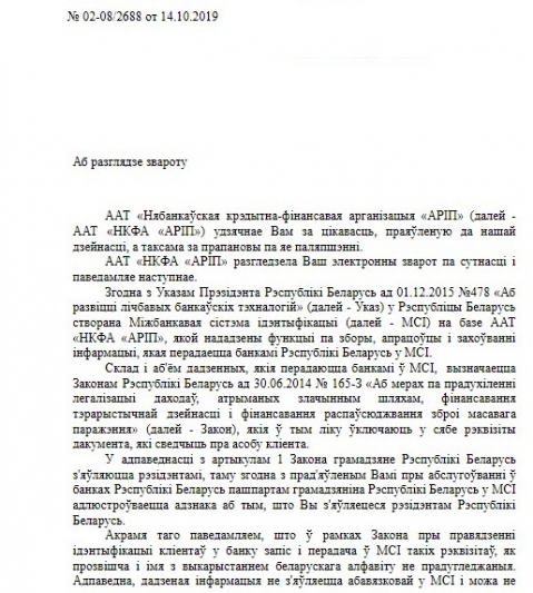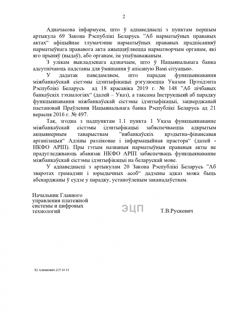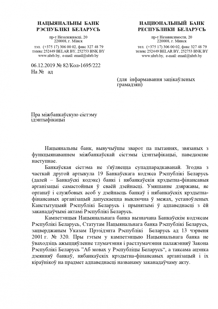 У адказе на электронны зварот (№ 02-08/2688 от 14.10.2019) з просьбай даперакласці сістэму Міжбанкаўскай ідэнтыфікацыі на беларускую мову намеснiца старшынi праўлення АРІП Н.М.Штэўнiна адказала адносна ўжывання беларускай мовы ў сістэме, што "пры правядзенні ідэнтыфікацыі кліентаў у банку запіс і перадача ў МСІ такіх рэквізітаў, як прозвішча і імя з выкарыстаннем беларускага алфавіту не прадугледжаныя" і "адпаведна, дадзеная інфармацыя не з'яўляецца абавязковай у МСІ і можа не перадавацца банкам".