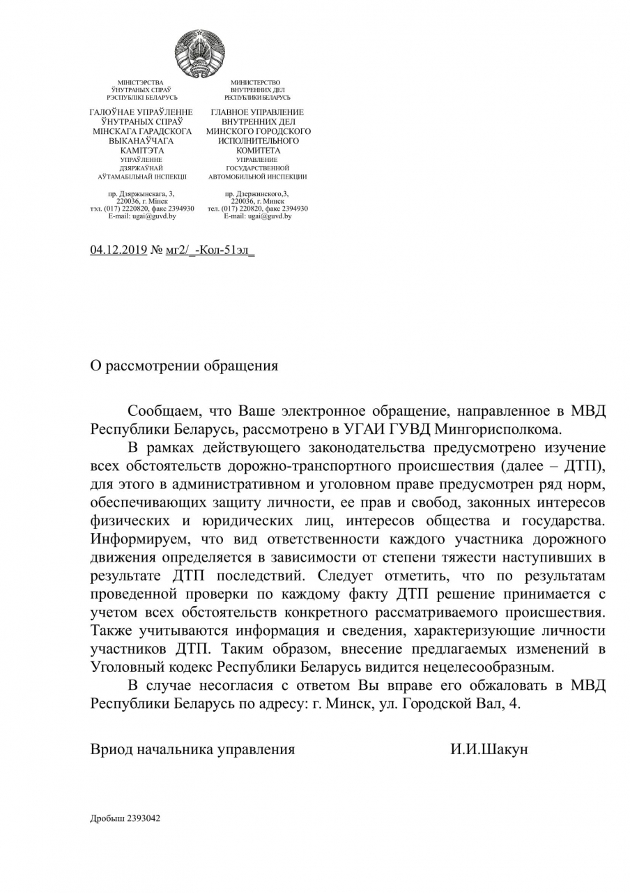 В связи с чем, просим инициировать внесение изменений в Уголовный кодекс Республики Беларусь и освободить водителей транспортных средств от привлечения к ответственности в случае ДТП, когда пешеход либо велосипедист, находясь на дорогах вне населенных пунктов, не были обозначены в соответствии с ПДД светоотражающим элементом в тёмное время суток.