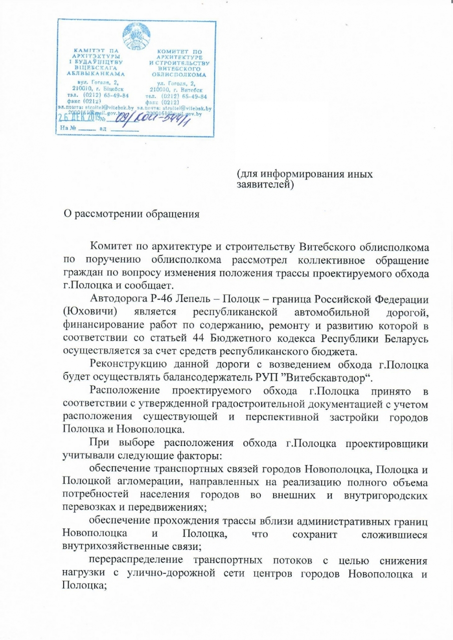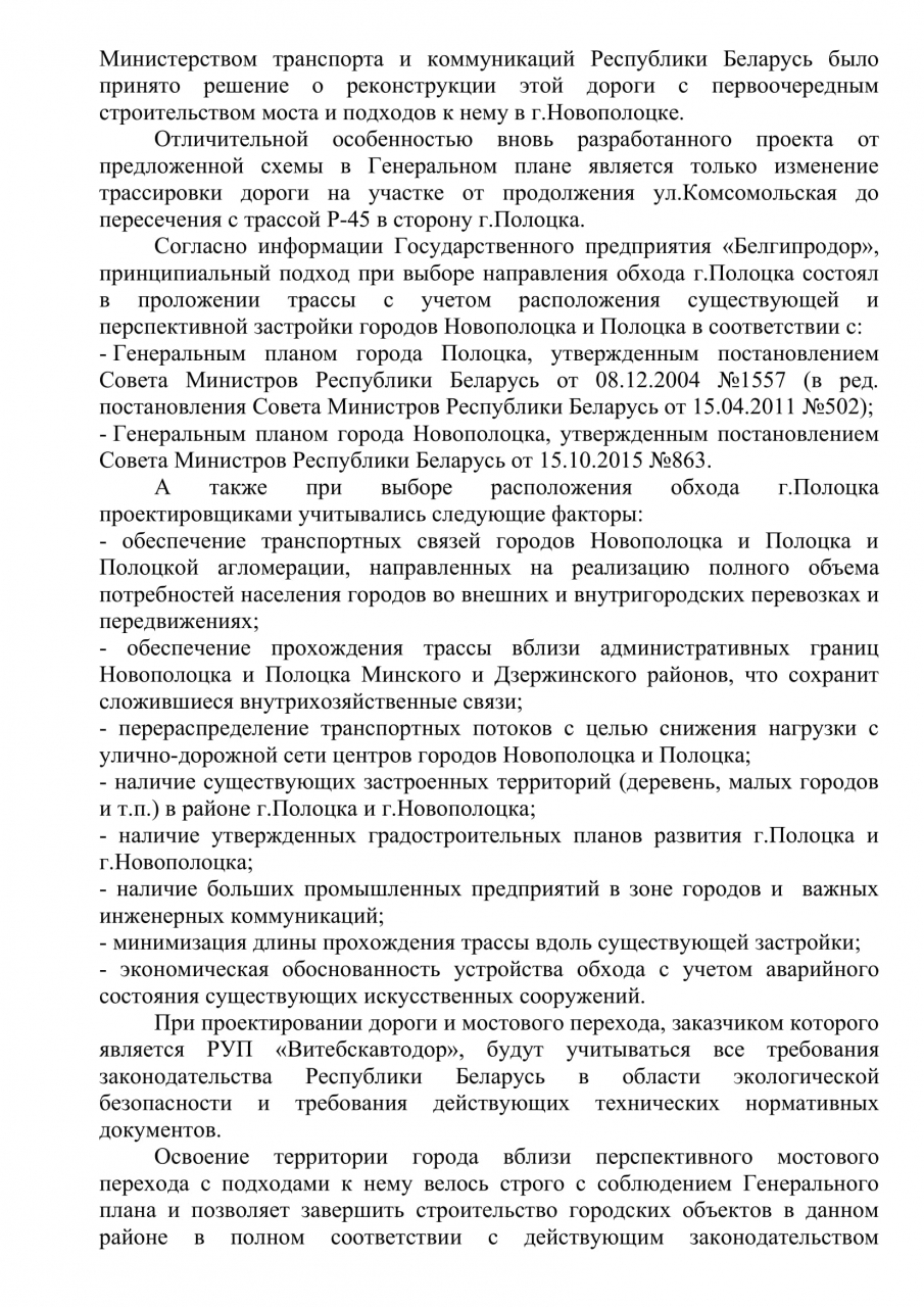 Таким образом, просим разобраться с вышеописанным вопросом и предотвратить движение потоков транспорта с трассы Р46 через жилые микрорайоны Новополоцка, таким образом защитив здоровье, спокойствие, безопасность детей местных жителей.