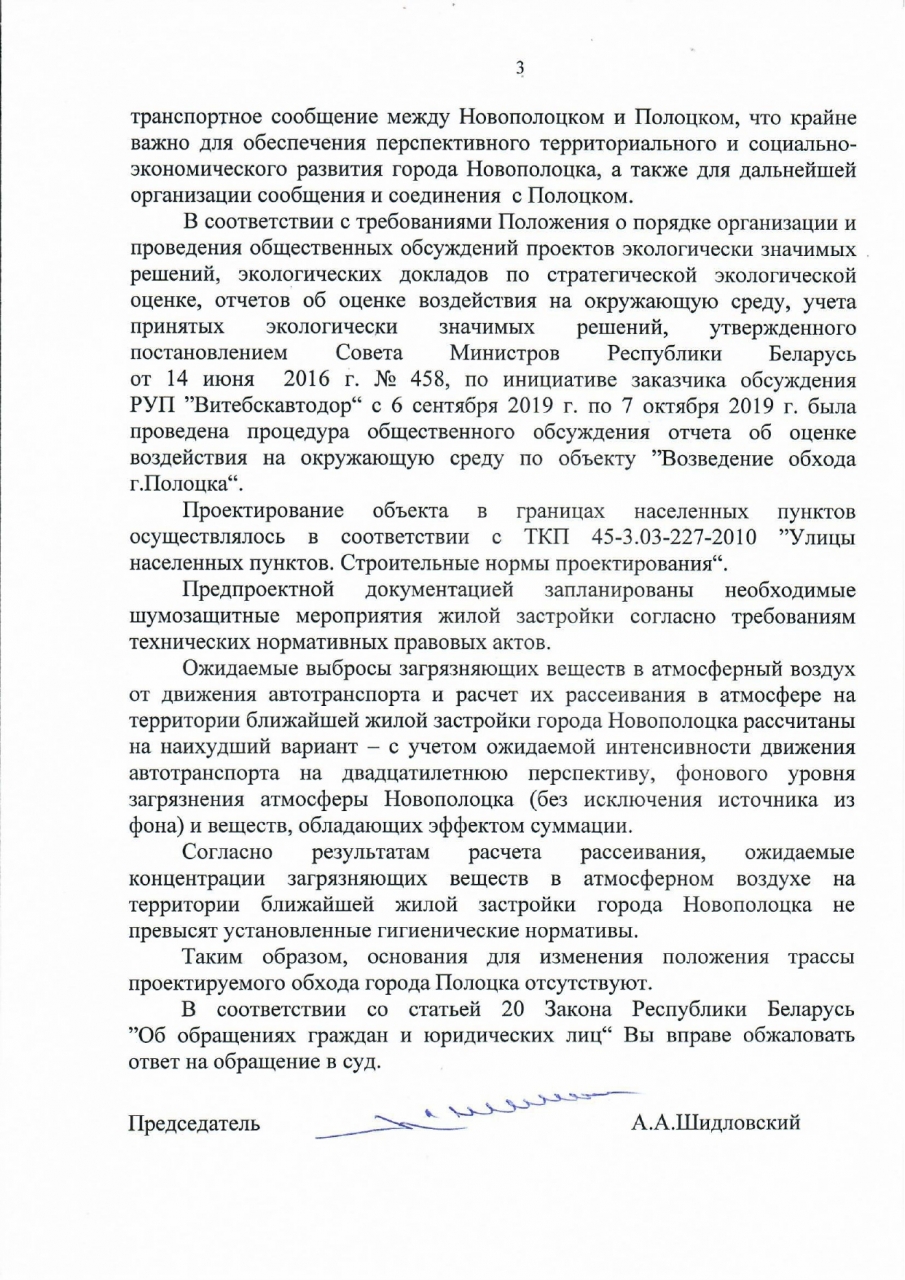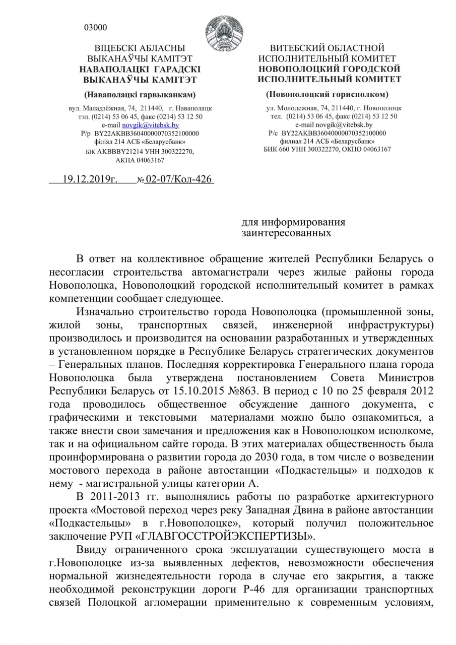 Настоящим обращением мы выражаем свой протест против прокладывания автомагистрали Р46 через жилые районы города Новополоцка: восьмой, девятый микрорайон и посёлок Полимировский.