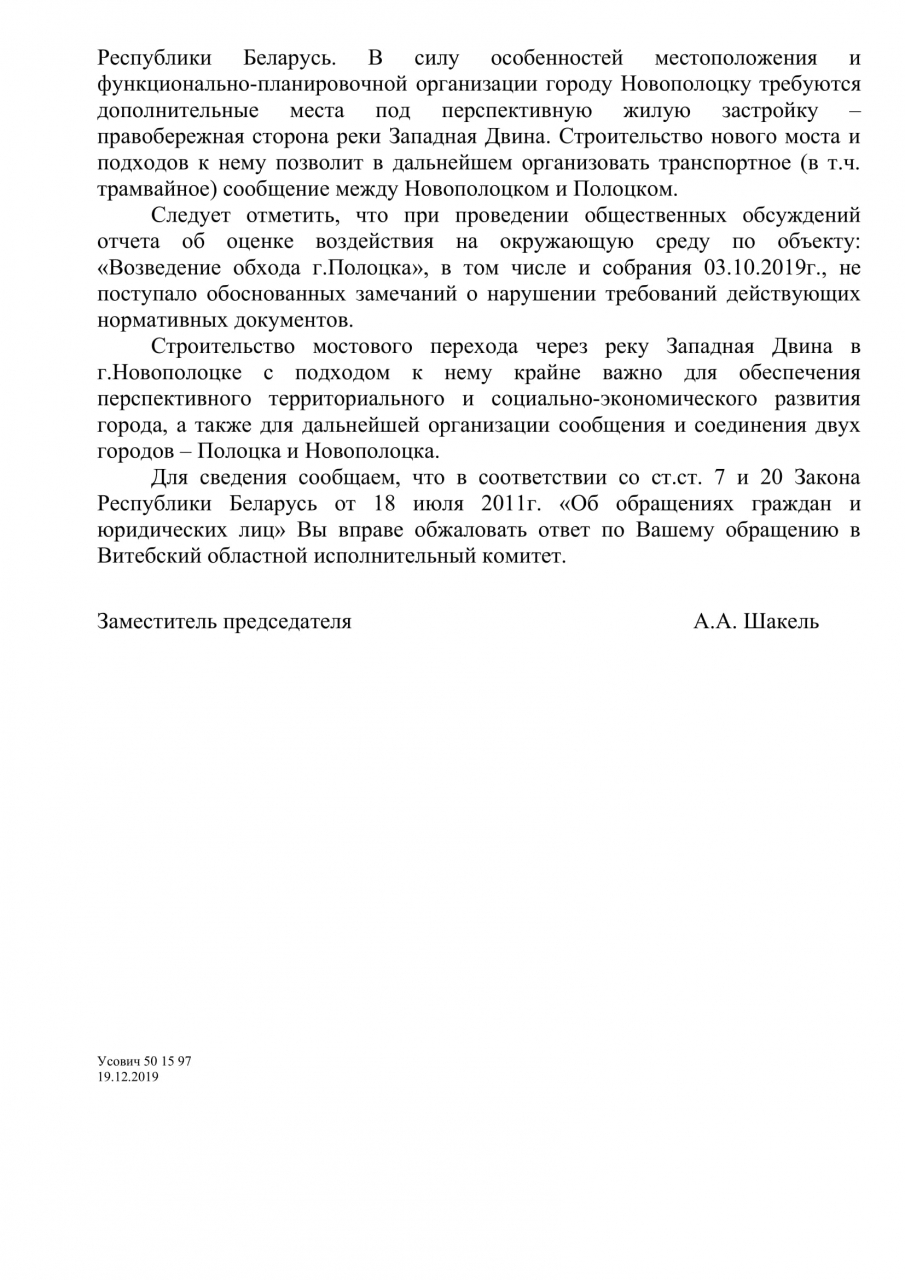 При проектировании дороги и мостового перехода, заказчиком которого является РУП «Витебскавтодор», будут учитываться все требования законодательства Республики Беларусь в области экологической безопасности и требования действующих технических нормативных документов.