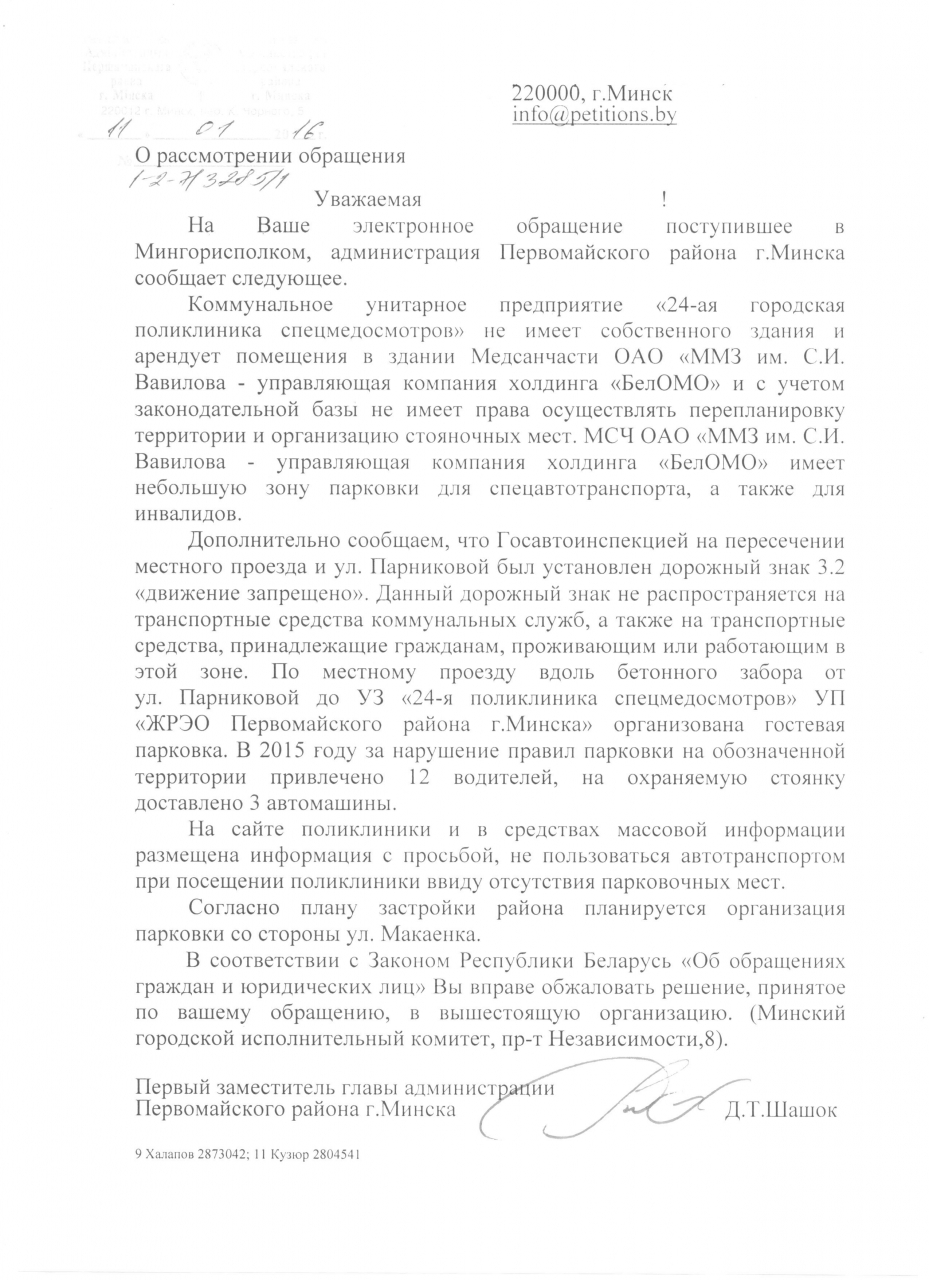 24-я поликлиника спецмедосмотров ул.Фмлимонова, 53. Подъезд с ул.Парниковой, тупиковый. Не организовано ни одного парковочного места для автотранспорта. Несмотря на знак, запрещающий проезд, ежедневно огромный поток машин в обе стороны направляется по 1 полосе ( 2-я полоса занята припаркованными автомобилями). Не ехать под запрещающий знак не могут, т.к. нет рядом парковок. Ежедневно создаются заторы, не могут проехать ни мусоровозы, ни скорые. Рядом школа, дети лавируют между машин. Если соотнести количество автовладельцв в Минске с общим количеством жителей Минска, то это издевательство над очень большим процентом минчан.