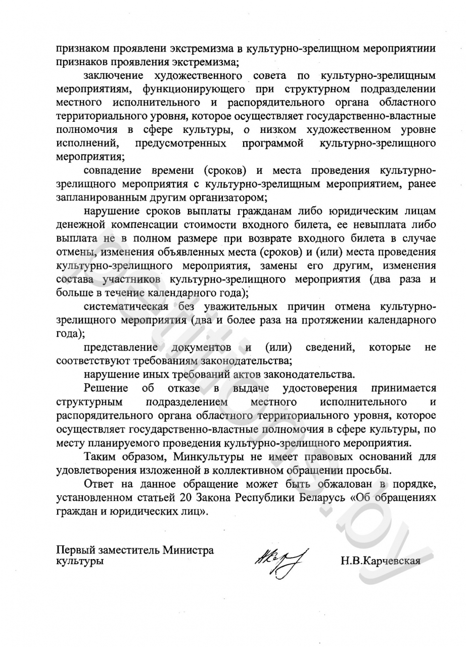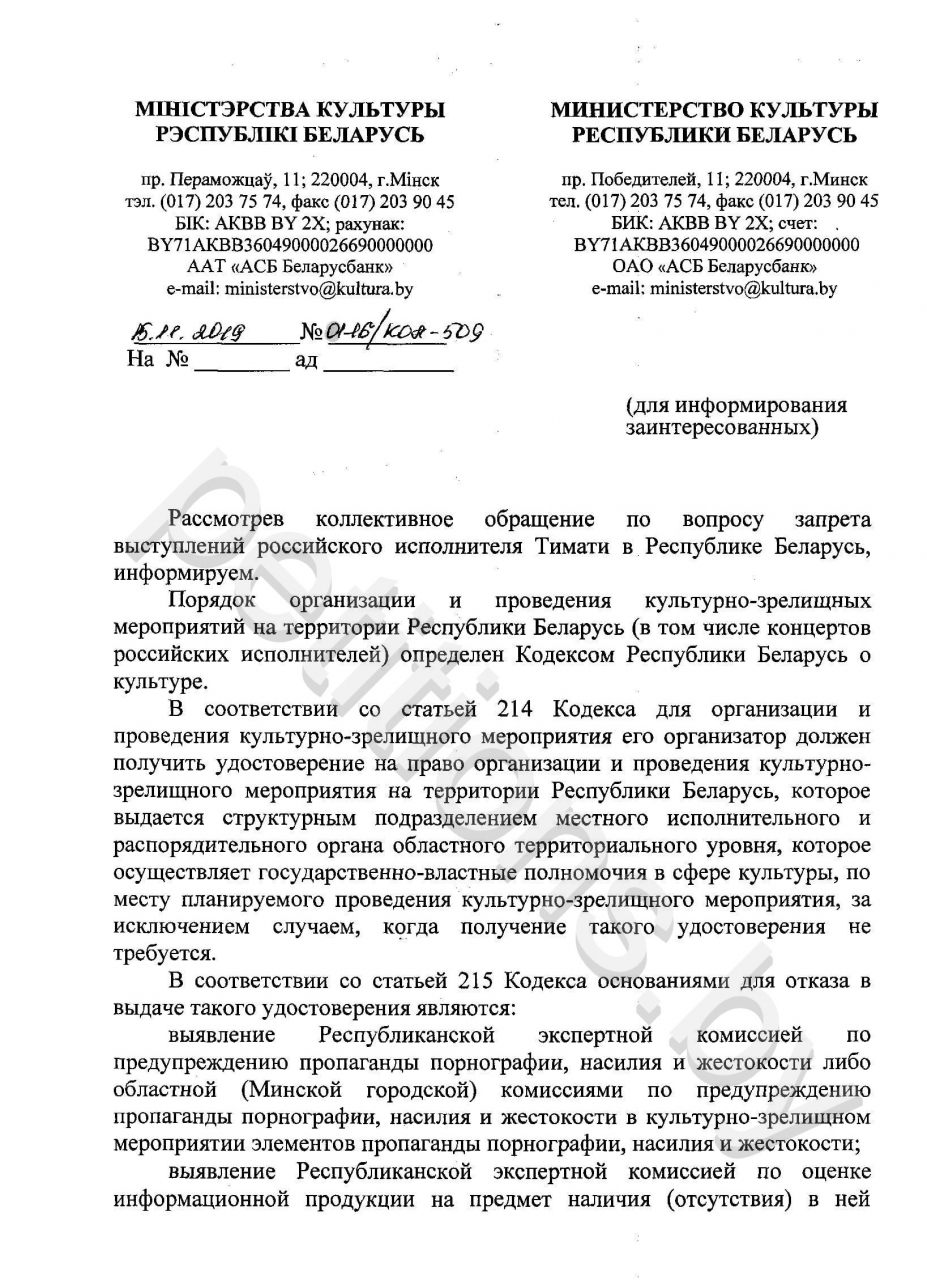 Таким образом, просим принять меры, направленные на запрет организации концертов российского музыкального исполнителя Тимати на территории Республики Беларусь.