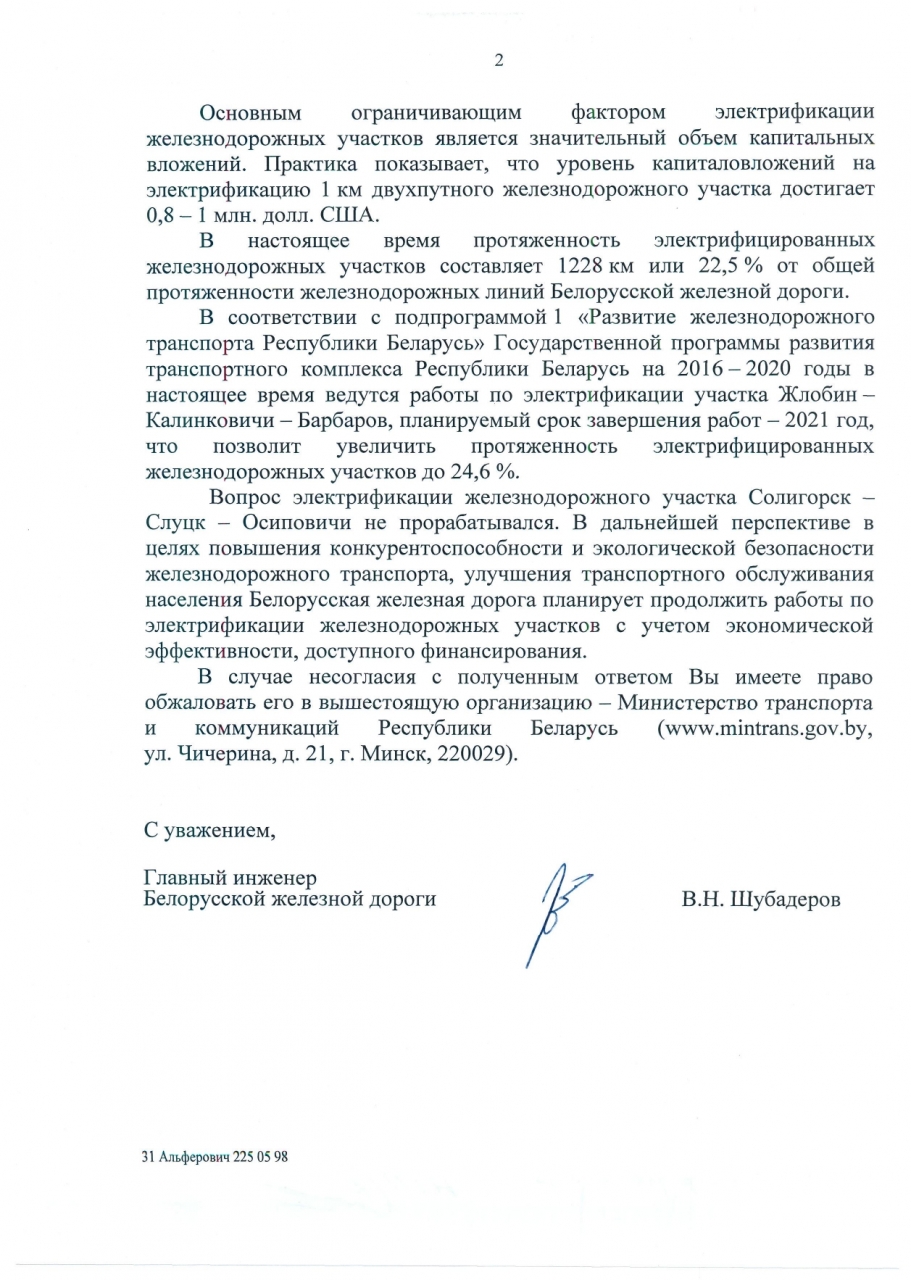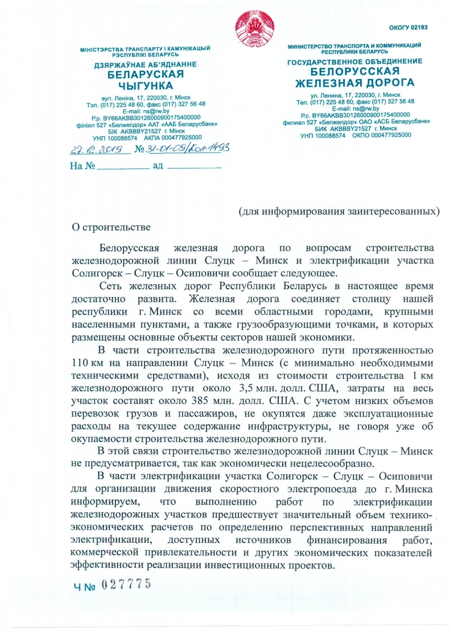 Если нет возможности сделать полноценное железнодорожное сообщение между указанными городами, тогда необходимо рассмотреть вопрос об организации движения скоростной электрички Солигорск-Слуцк-Осиповичи-Минск, без лишних остановок. Есть электробусы, сделайте электричку такую. Или вдоль новой автомобильной дороги сделайте что-то вроде скоростного трамвая.