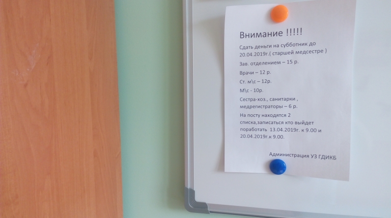 В УЗ "Городская детская инфекционная клиническая больница", по имеющимся у заявителей данным, объявление об обязательной (всегда присутствовало это слово!) подписке или сборе денег на субботник заканчивалось подписью «Администрация».