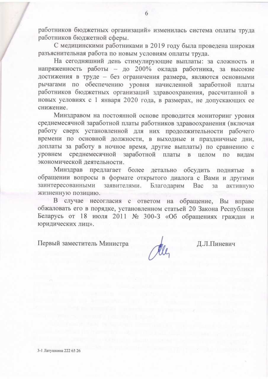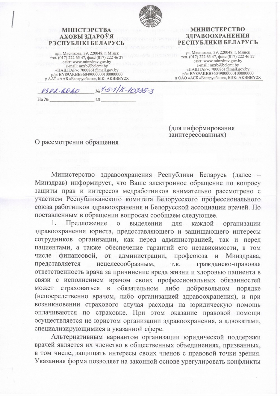 Ответ не по существу на настоящее обращение и/или отсутствие конкретных шагов по решению обозначенных проблем будут означать не что иное, как эксплуататорское и потребительское отношение к работникам, игнорирование и замалчивание насущных проблем белорусской медицины, недальновидность и отсутствие прагматизма в этой области. При таком, крайне нежелательном для нас развитии событий, мы предрекаем скорый и неизбежный отток кадров за рубеж и в другие сферы и возлагаем всю ответственность за последствия на Министерство здравоохранения.