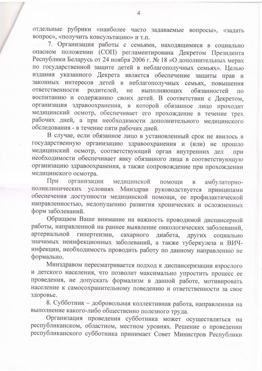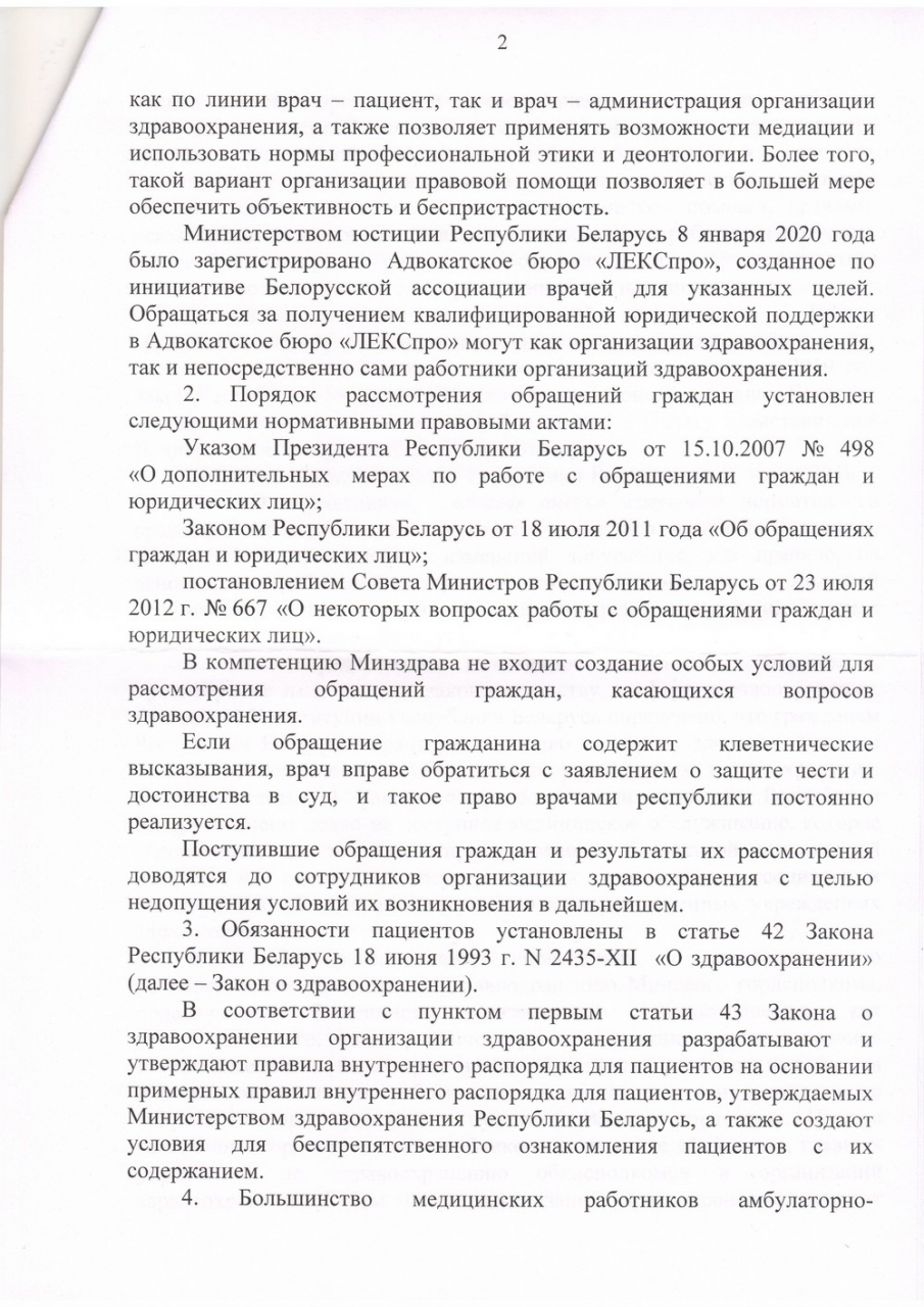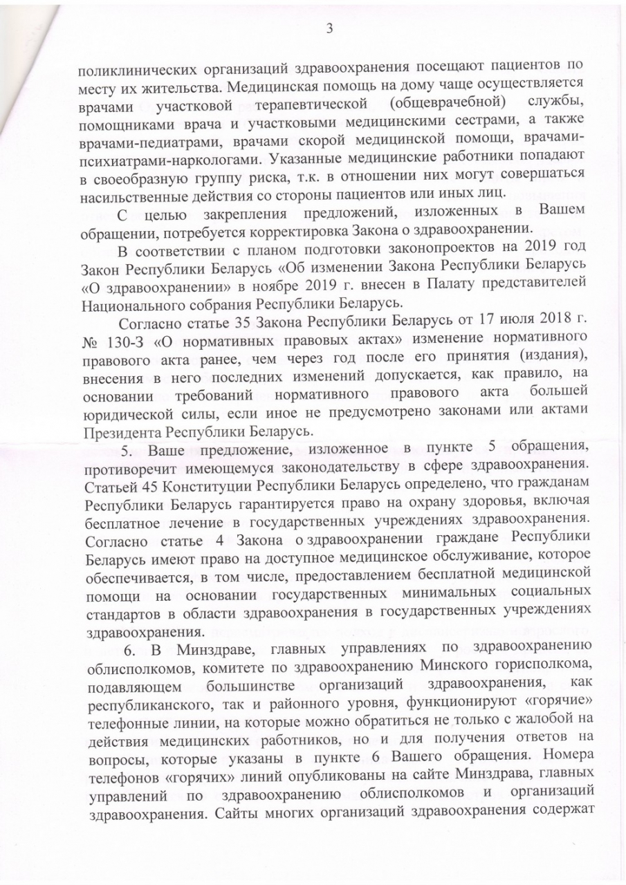 3) Разработать и утвердить НОРМЫ ПОВЕДЕНИЯ ПАЦИЕНТОВ, родственников пациентов, аналогичные «Правилам медицинской этики и деонтологии» (Постановление Минздрава Республики Белаусь от 07.08.2018 №64) для медицинского персонала. Ввести меры воздействия на пациентов (вплоть до административной ответственности), при несоблюдении этих норм. Если пациенты вправе требовать к себе уважительного отношения, то медработники – и подавно. Гражданин должен понимать, что если выступает в роли пациента, то должен вести себя соответствующим образом.