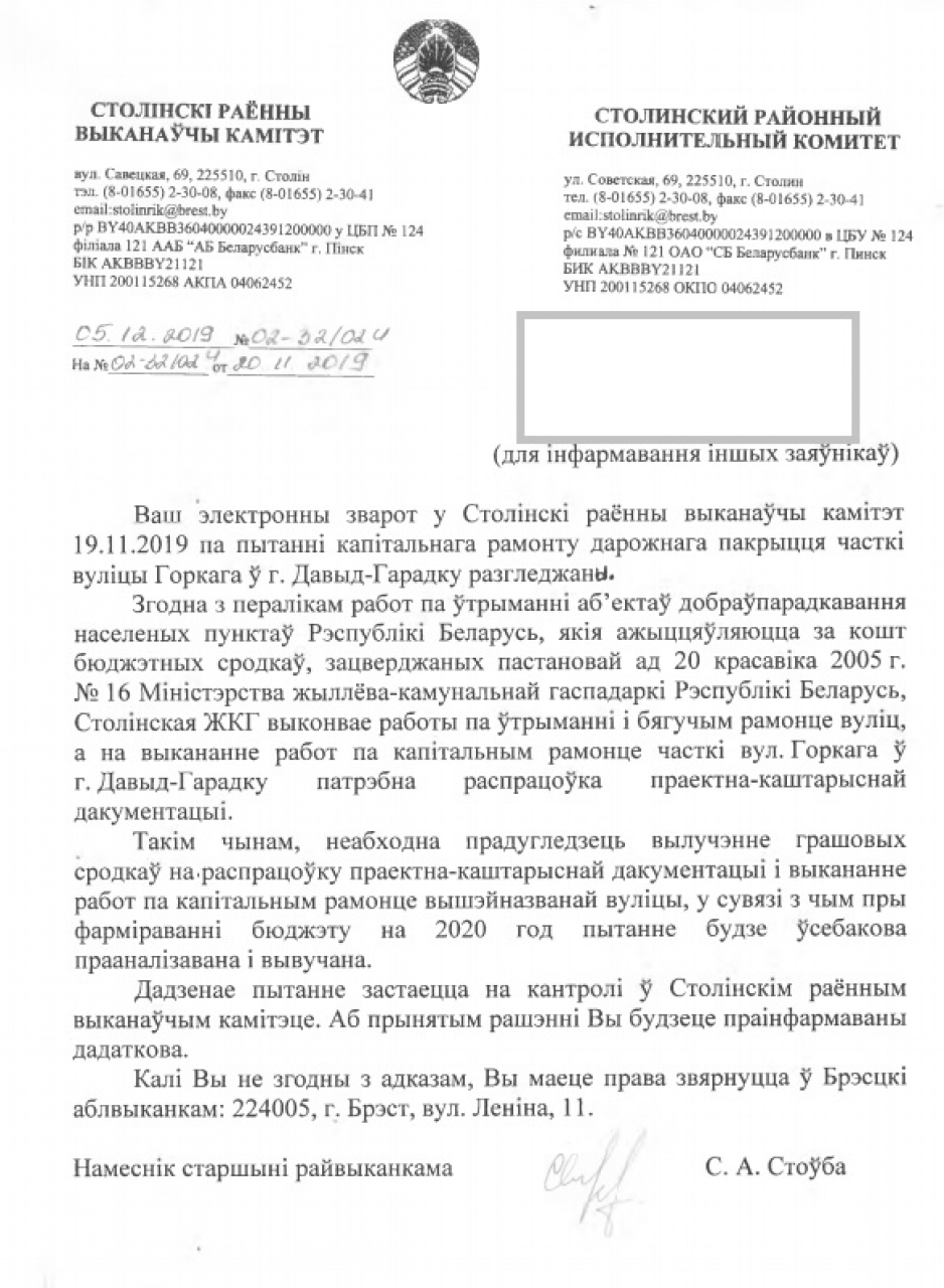 - закласці ў раённы бюджэт на 2020 год сродкі, неабходныя для капітальнага рамонту дадзенай вуліцы;
