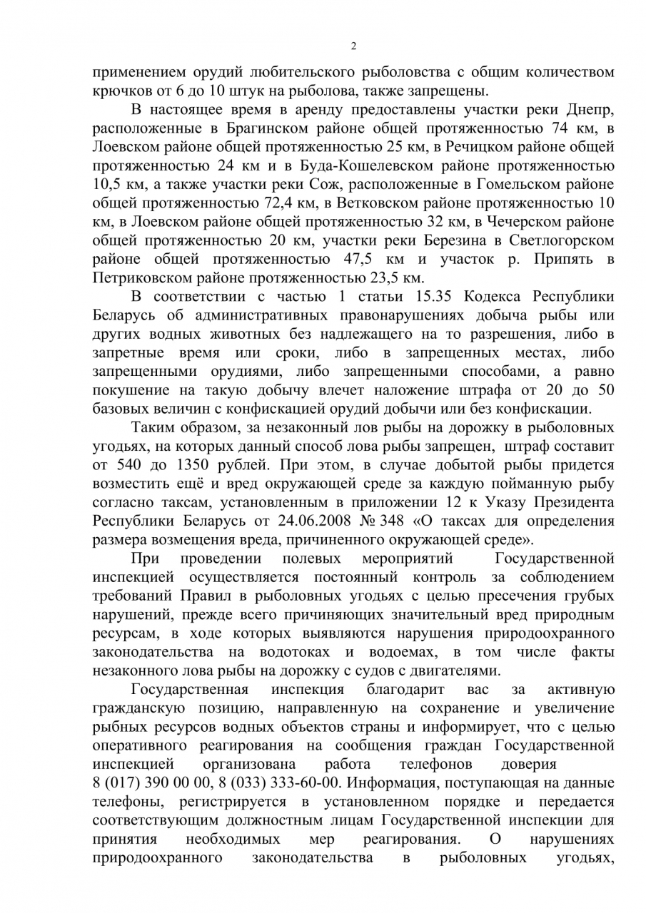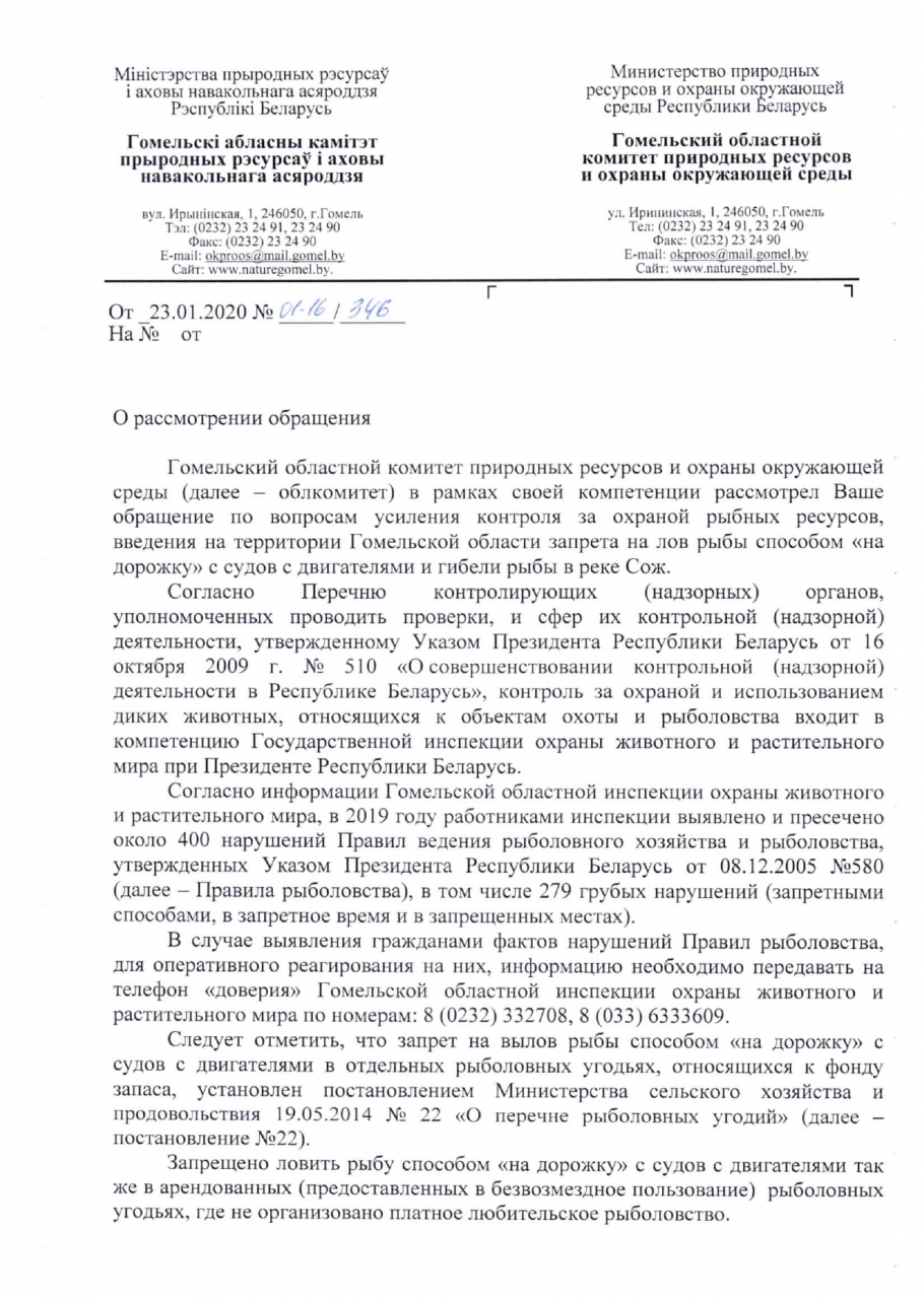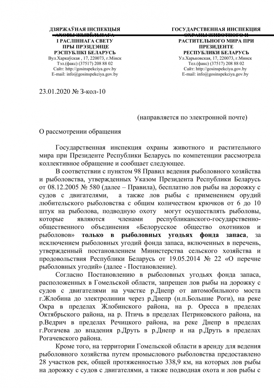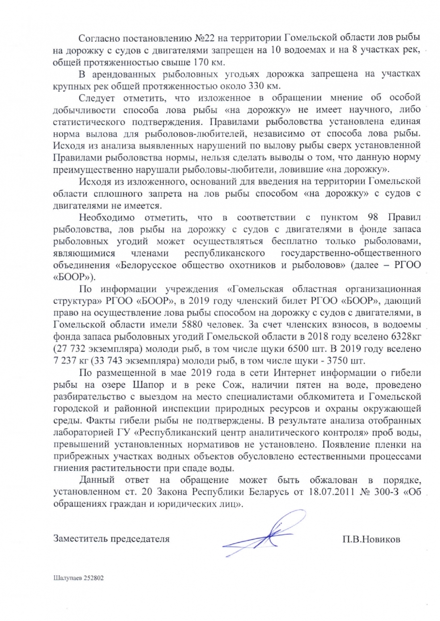 Просим ещё раз рассмотреть возможность запрета вида ловли «дорожка» во всей Гомельской области, и инициировать внесение соответствующих поправок в законодательстве. Как минимум вынести этот вопрос на рассмотрение в соответствующее Министерство.