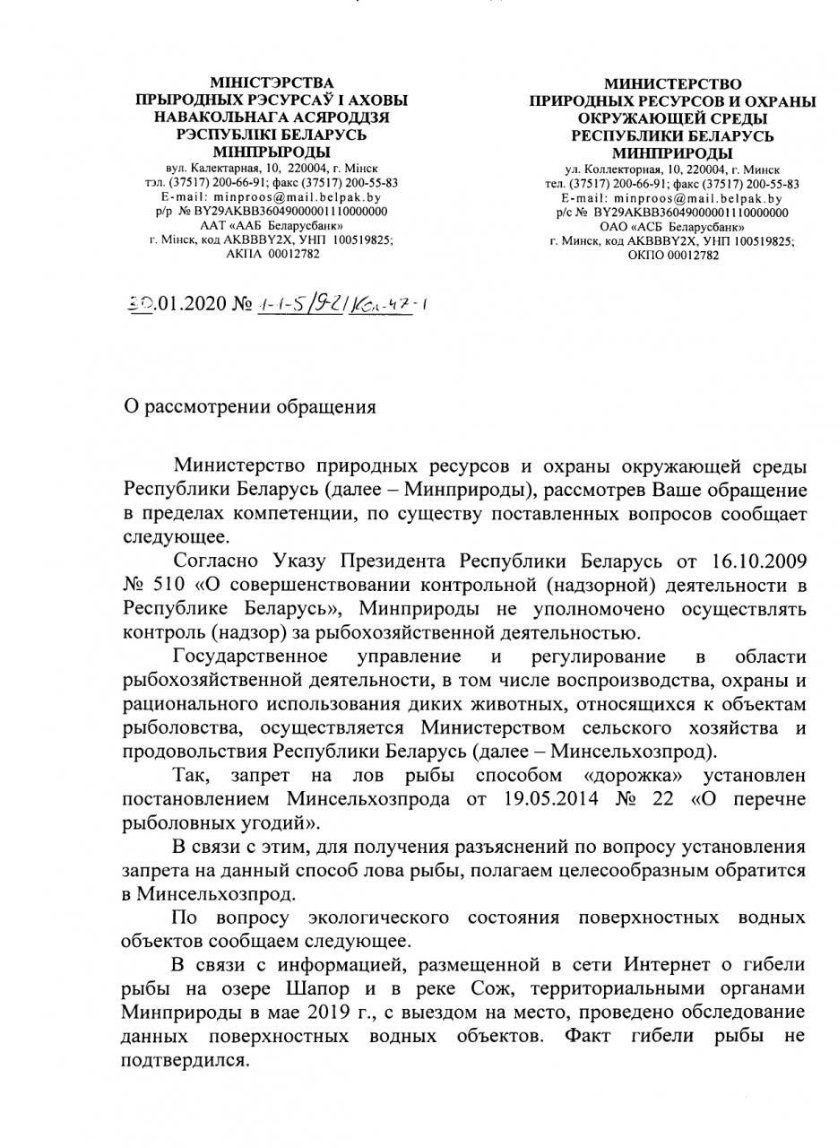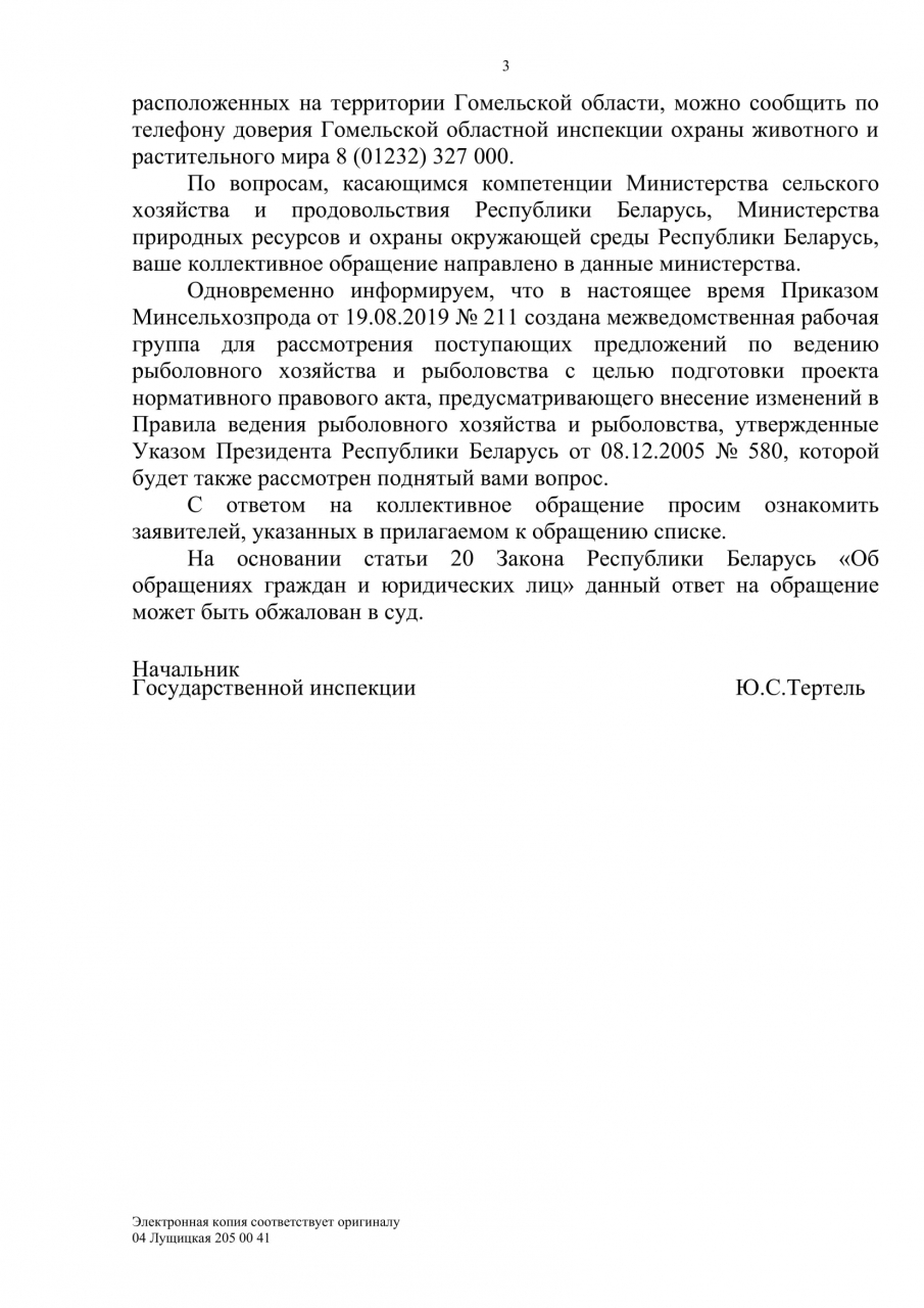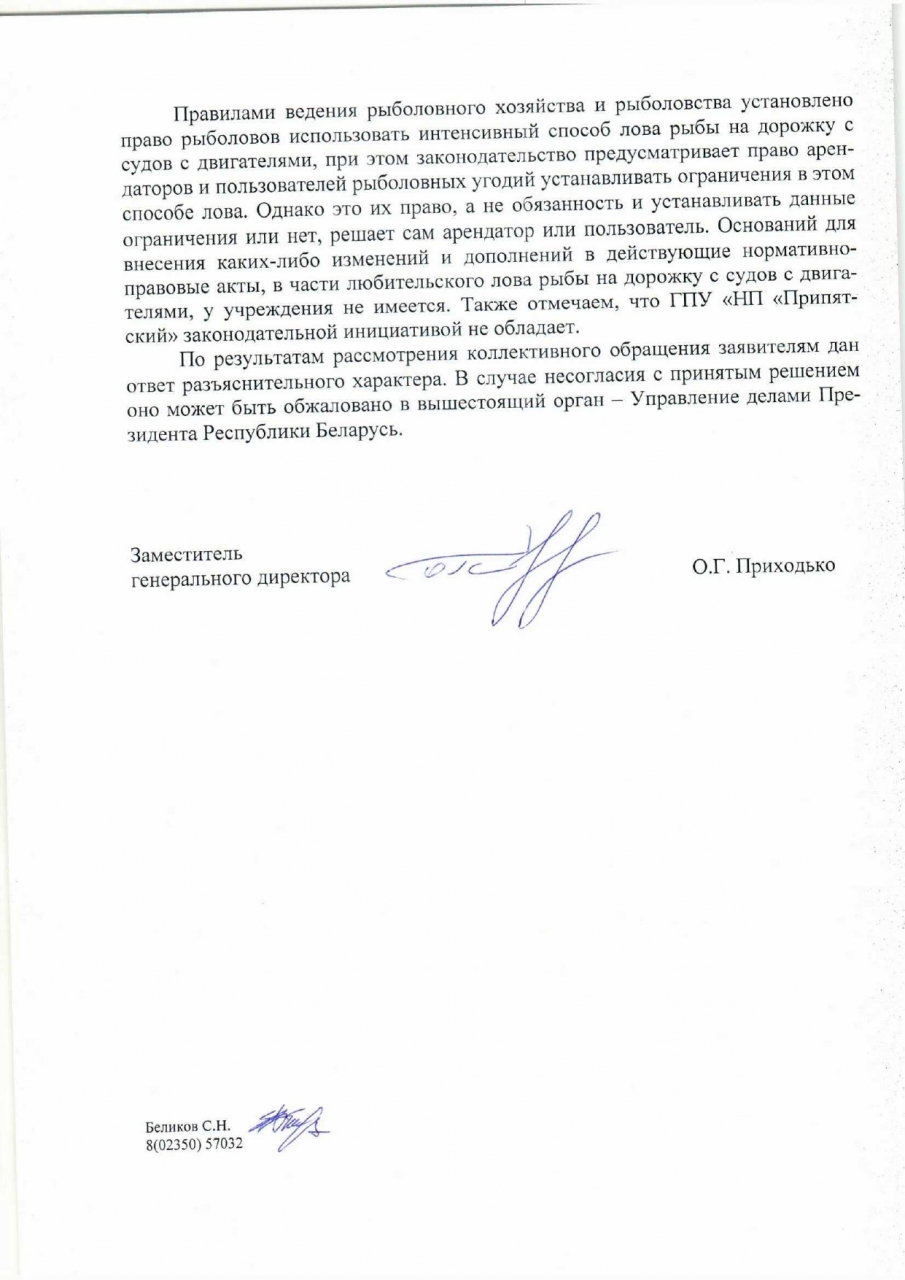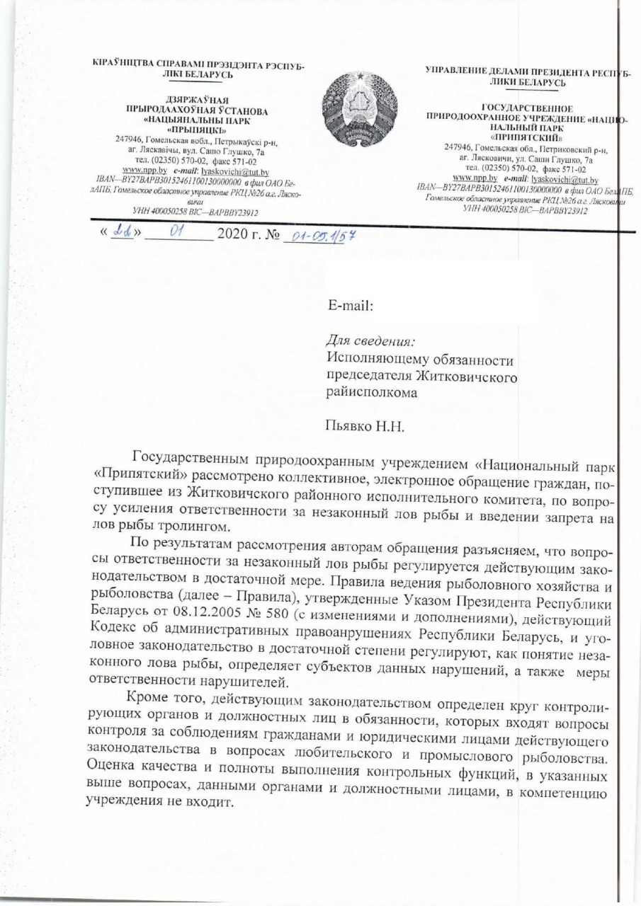 Просим ещё раз рассмотреть возможность запрета вида ловли «дорожка» во всей Гомельской области, и инициировать внесение соответствующих поправок в законодательстве. Как минимум вынести этот вопрос на рассмотрение в соответствующее Министерство.