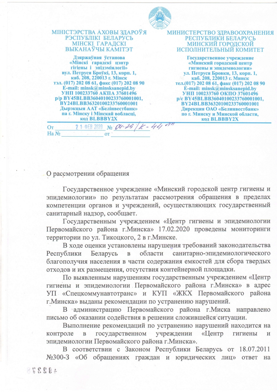 В адрес УП "Спецкоммунавтотранс" и КУП "ЖКХ Первомайского района г.Минска" направлены рекомендации по устранению выявленных нарушений, а в администрацию Первомайского района г.Минска письмо об оказании содействия в решении сложившейся ситуации.