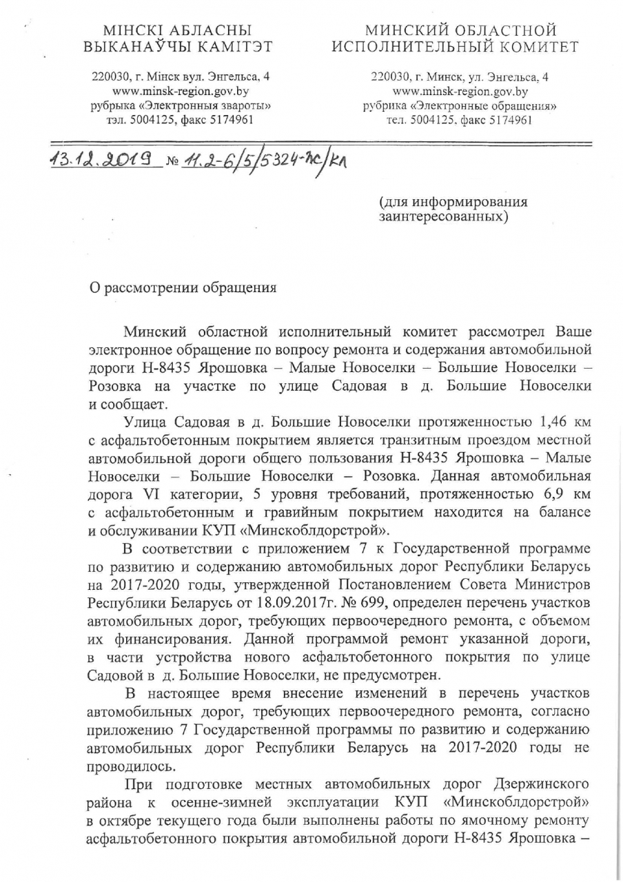 местных автомобильных дорог в Республике Беларусь“ являются облисполкомы, просим Минский облисполком внести в план развития и содержания автодорог на 2020-2023 годы данный участок дороги, чтобы в будущем обеспечить комфортный подъезд автомобилям, транспорту ЖКХ, а также службам быстрого реагирования.