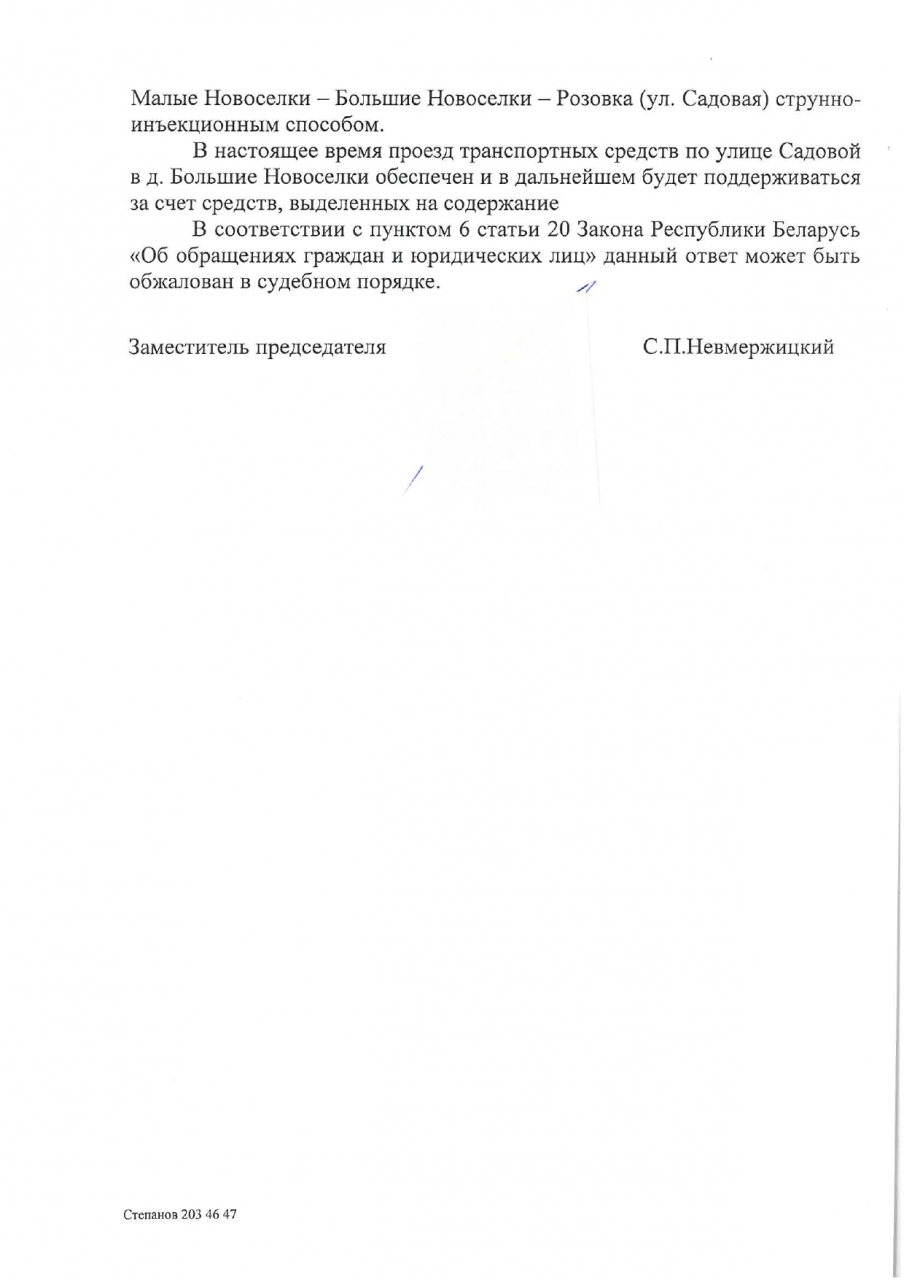 После направления электронного обращения граждан в филиал КУП "Минскоблдорстрой"-"ДРСУ-210" по вопросу ремонта и асфальтирования дороги Н-8435 "Ярошовка-Малые Новоселки-Большие Новоселки-Розовка" от последнего получен ответ от 05.11.2019 №992 (копия прилагается), согласно которому модернизация участка дороги H-8435 в деревне Большие Новосёлки по улице Садовая (от улицы Заводская до улицы Садовая, 30) не планируется.