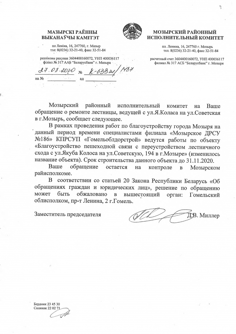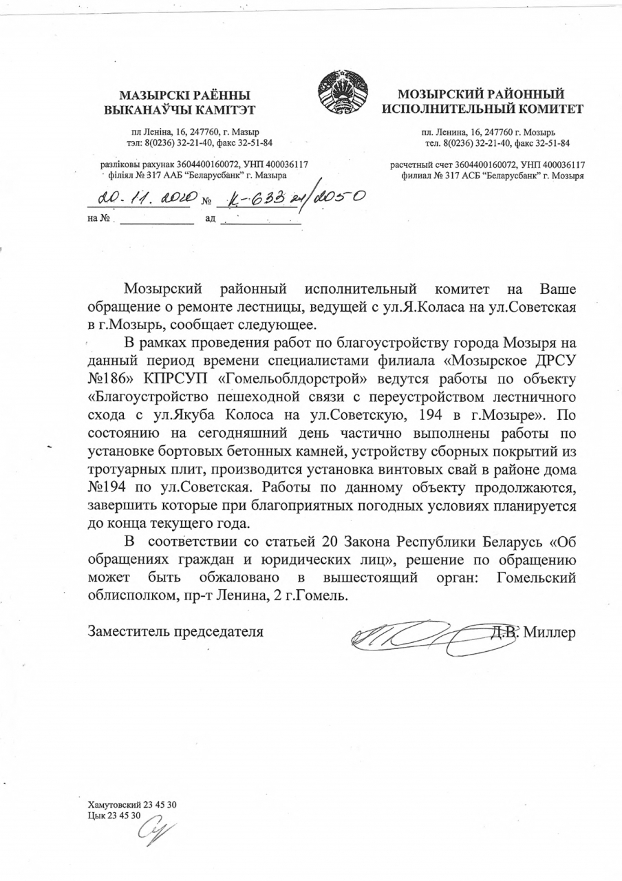 UPD. Специалистами филиала "Мозырское ДРСУ №186" КПРСУП "Гомельоблдорстрой" ведутся работы по объекту "Благоустройство пешеходной связи с переустройством лестничного схода с ул.Я.Коласа на ул.Советскую, 194, в г.Мозыре". Срок строительства объекста до 30.11.2020.