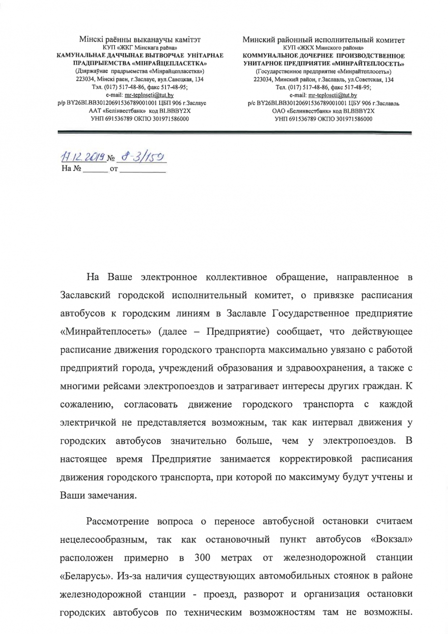 Согласовать движение городского транспорта с каждой электричкой не представляется возможным, тем не менее, ГП "Минрайтеплосесть" занимается в настоящее время корректировкой расписания городского транспорта, при которой будут учтены замечания. содержащиеся в обращении. Перенос автобусной остановки нецелесообразен.
