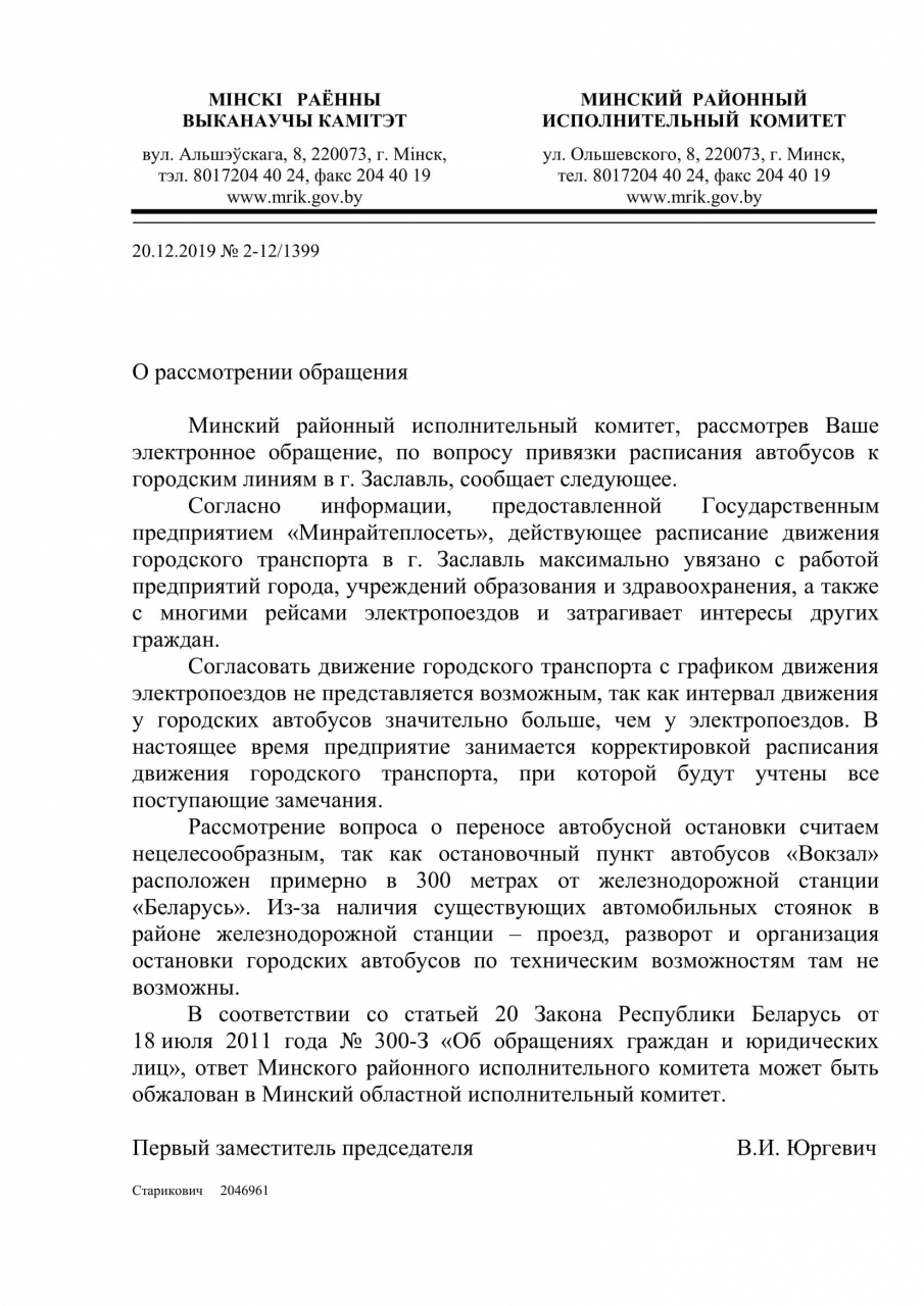 Просим привязать расписание общественного транспорта к расписанию "Городских Линий" приходящих и отправляющихся со станции "Беларусь" в Заславле.