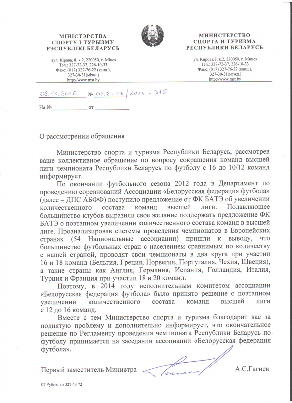 Просим МинСпорта и АБФФ провести детальный анализ и проработку реформы Высшей лиги Чемпионата Республики Беларусь по футболу для улучшения и развития профессионального футбола в стране.