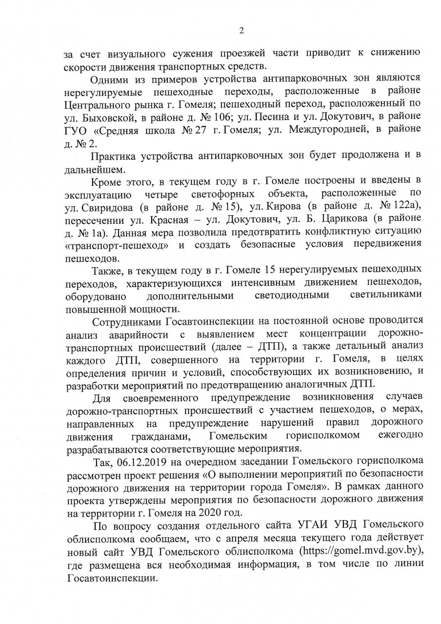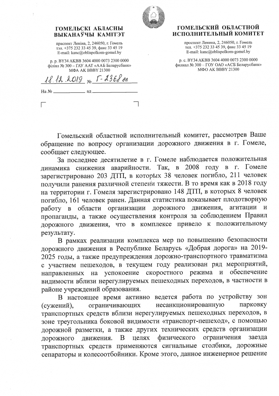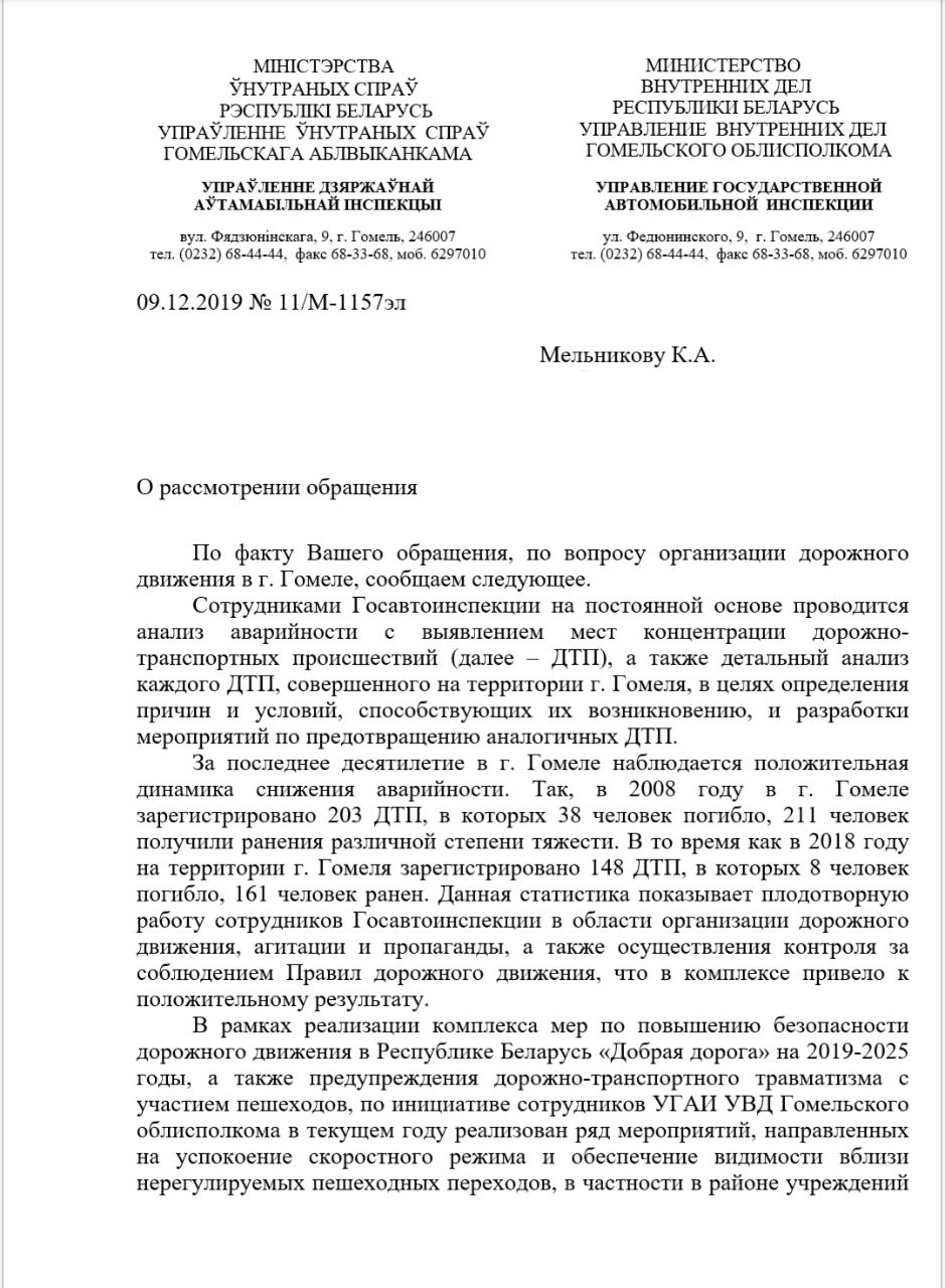 Просьба в ответе на данное обращение предоставить статистику по динамике количества ДТП с участием пешеходов в городе Гомеле за последние 10 лет (если имеются таковые данные), описать меры, принятые в 2019 по организации безопасного дорожного движения, а также рассмотреть приведённые предложения и дать конструктивный ответ о возможности реализации данной программы и привести сроки, какие потребуются для реализации хотя бы этих мер (1 год? 3 года? 10лет?).
