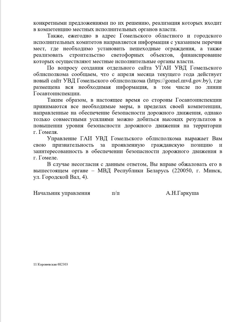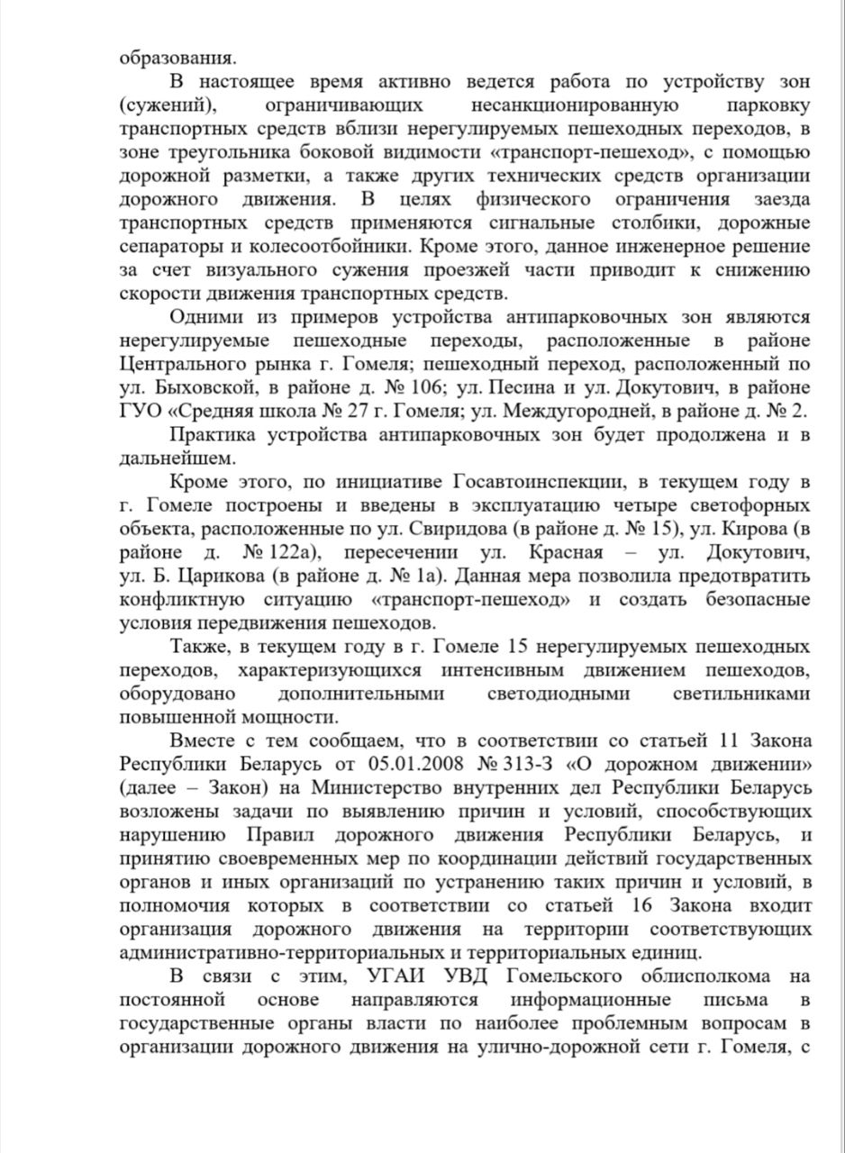 Мы, неравнодушные граждане, пешеходы, водители, призываем вас первоочерёдно, в пределах компетенции, взяться за эту проблему, чтобы предотвратить дальнейшие случаи травмирования пешеходов, чтобы сделать город Гомель безопасным для жизни, чтобы пешеход не боялся пересекать проезжую часть, чтобы водитель не испытывал стресс из-за внезапно появляющихся пешеходов на проезжей части дороги.