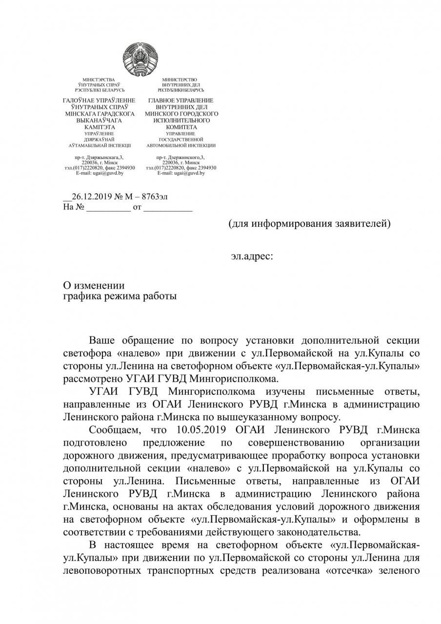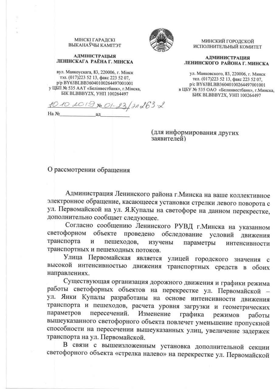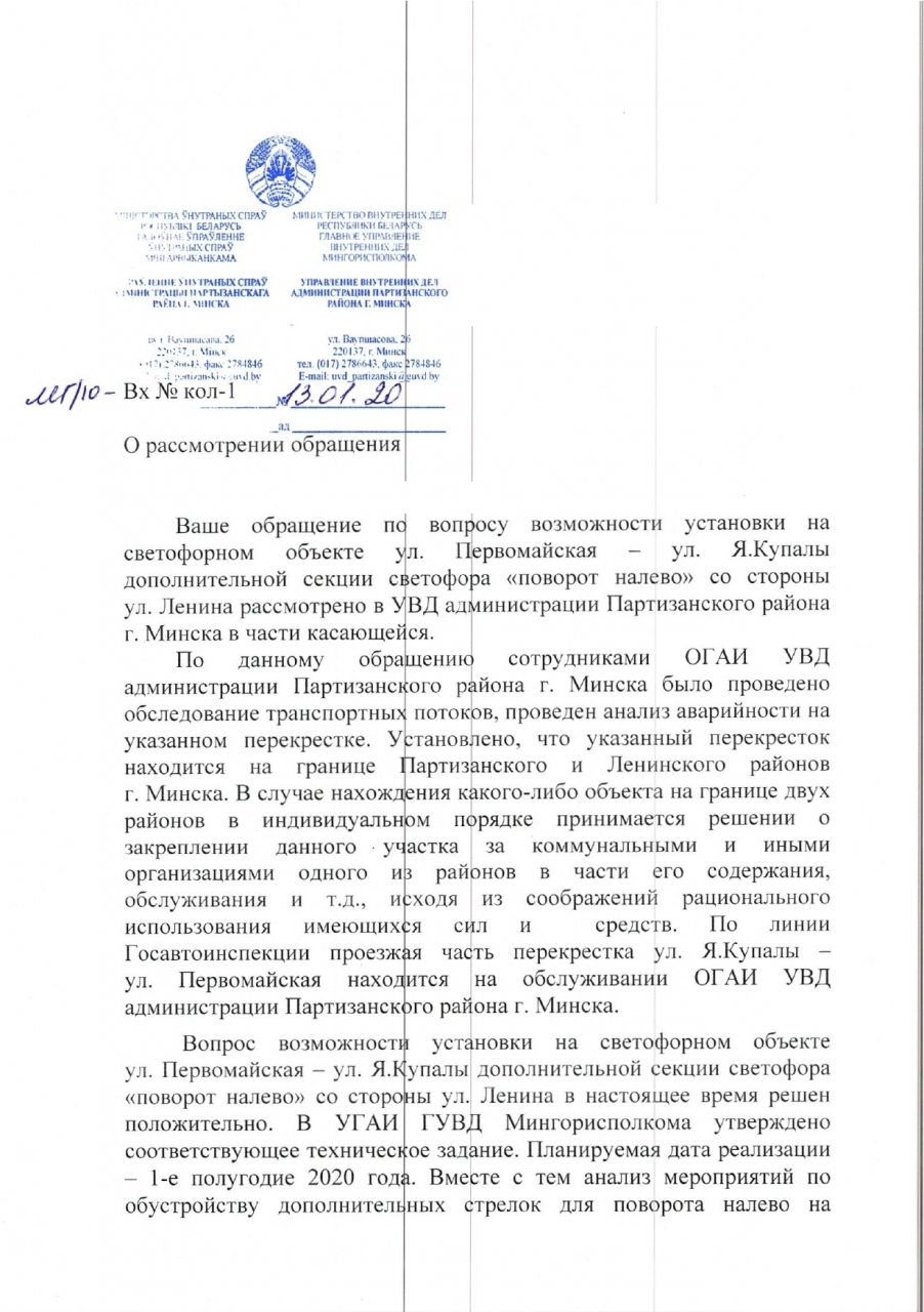 После положительного решения 10.10.2019 пришло письмо с ответом противоположным тому, что был дан 22.07.2019. В первых двух письмах от администрации Ленинского района и Ленинского РУВД говорилось, что проведено обследование и дана команда на установку стрелки поворота налево с ул.Первомайской на ул.Я.Купалы. В новом письме говорится, что проведено обследование и подобная установка нецелесообразна. При этом письмо написано, по нашему мнению, в такой форме, будто это первый ответ, а старых ответов и не было.