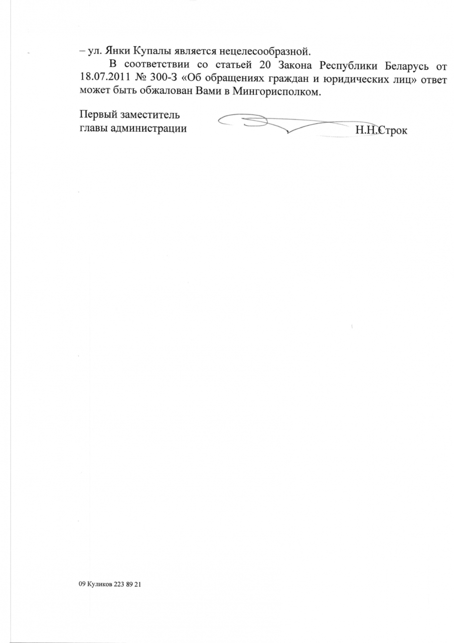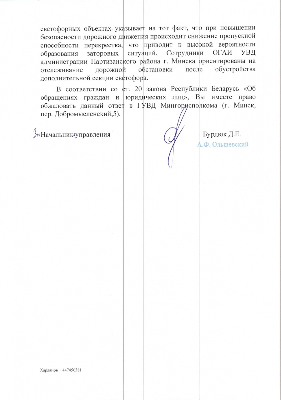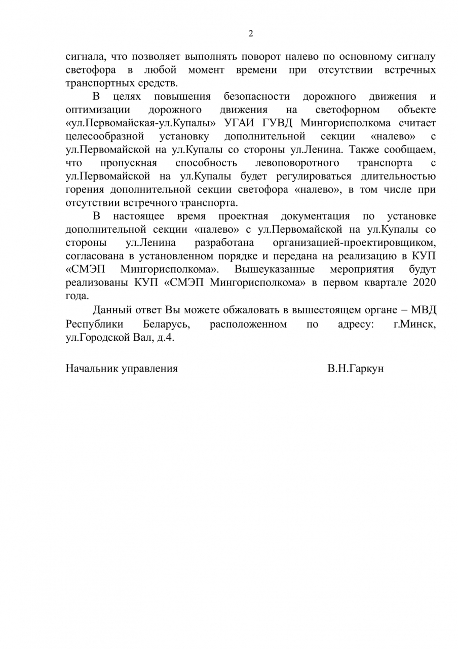 После положительного решения 10.10.2019 пришло письмо с ответом противоположным тому, что был дан 22.07.2019. В первых двух письмах от администрации Ленинского района и Ленинского РУВД говорилось, что проведено обследование и дана команда на установку стрелки поворота налево с ул.Первомайской на ул.Я.Купалы. В новом письме говорится, что проведено обследование и подобная установка нецелесообразна. При этом письмо написано, по нашему мнению, в такой форме, будто это первый ответ, а старых ответов и не было.