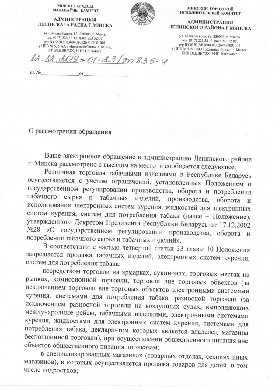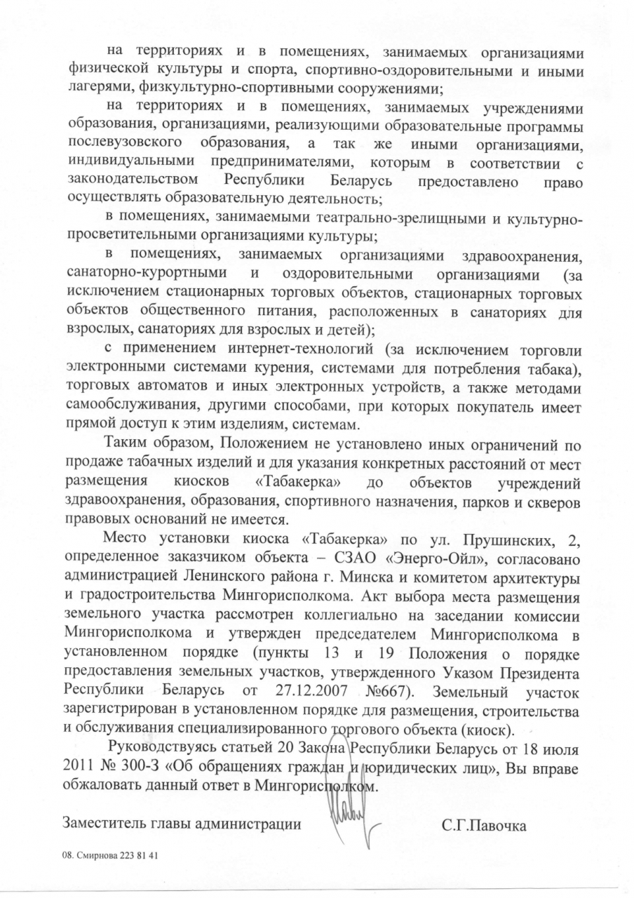 Место размещения "Табакерки" не противоречит требованиям Декрета Президента "О государственном регулировании производства, оборота и потребления табачного сырья и табачных изделий" и согласовано администрацией Ленинского района г.Минска и Комитетом архитектуры и градостроительства Мингорисполкома.