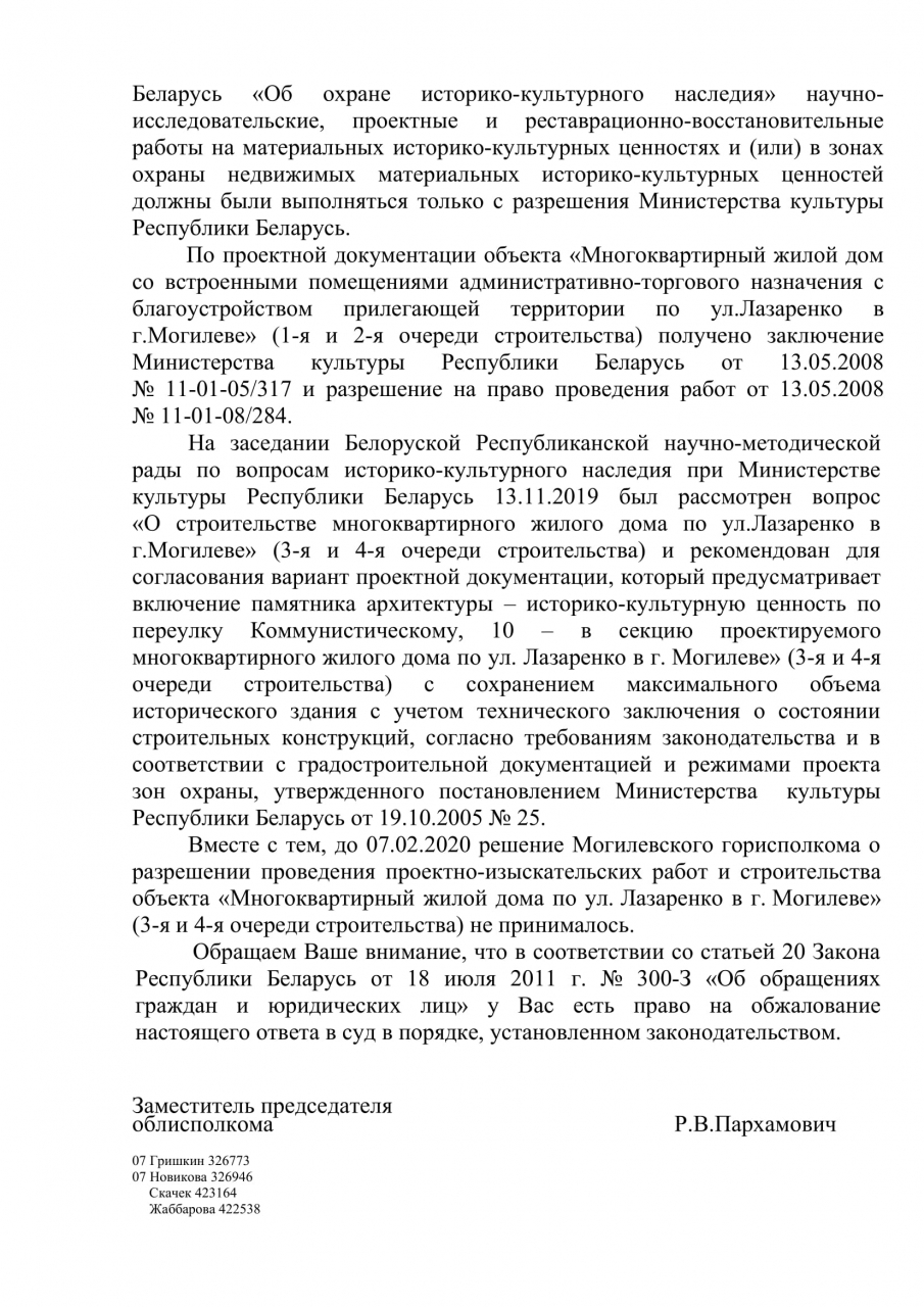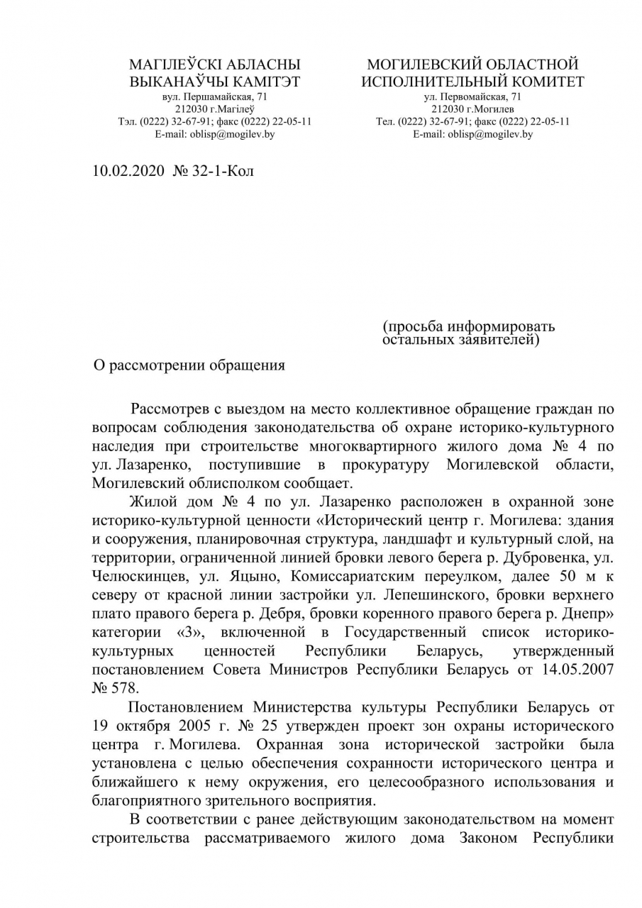Ранее в Министерство культуры было направлено электронное обращение о недопустимости завершения существующей стенки по ул. Лазаренко, 4 новой секцией, превосходящей старые по высоте, и включении в объём дома историко-культурной ценности по Коммунистическому переулку, 10. Обращение не было рассмотрено непосредственно в Министерстве, а перенаправлено в Могилёвский горисполком. В ответе Могилёвского горисполкома, подписанном первым заместителем председателя горисполкома А. Потёмкиным, указывалось, что строительство многоэтажного дома по ул.Лазоренко соответствует разработанному и утвержденному градостроительному проекту “Детальный план центральной части г. Могилёва с проектом регенерации исторической зоны. Корректировка. Этап 2. Западная часть проектируемого района” (далее ПДП). Однако, данный проект только в 2016 году проходил общественное обсуждение, когда все 3 существующие секции уже были возведены. Кроме того в самом ПДП “смычка” между многоэтажным жилым домом и существующей историко-культурной ценностью по Коммунистическому переулку, 10 выполняет общественную функцию (обозначена красным цветом), а не жилую (оранжевый), а по параметрам в плана - узкое, по сравнению со зданиями, к которым она примыкает, и криволинейное здание - можно утверждать, что оно малоэтажное.