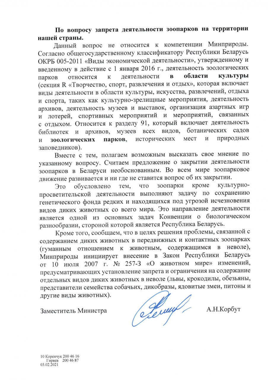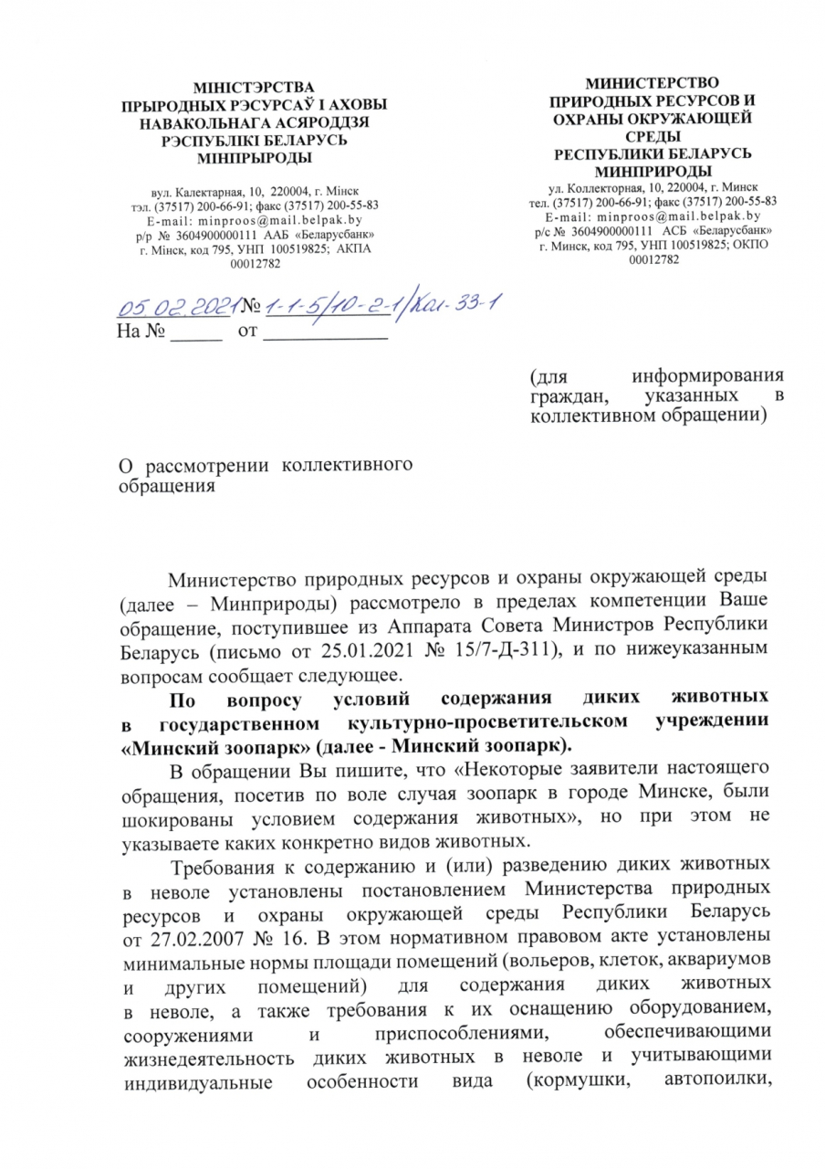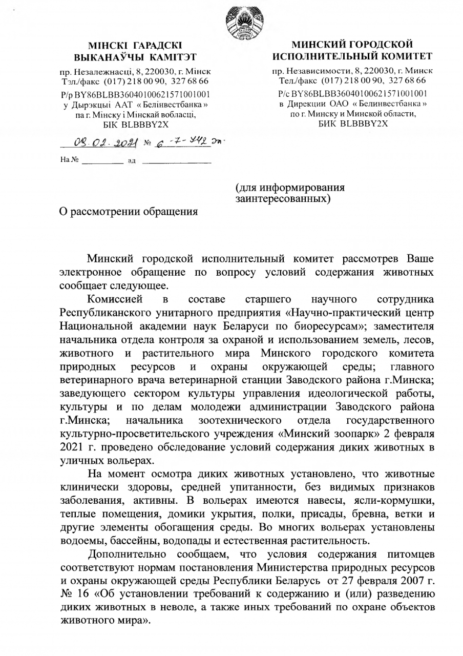 Условия содержания питомцев в Минском зоопарке соответствует нормам постановления Минприроды от 27.02.2007 №16 "Об установлении требований к содержанию и (или) разведению диких животных в неволе, а также иных требований по охране объектов животного мира".