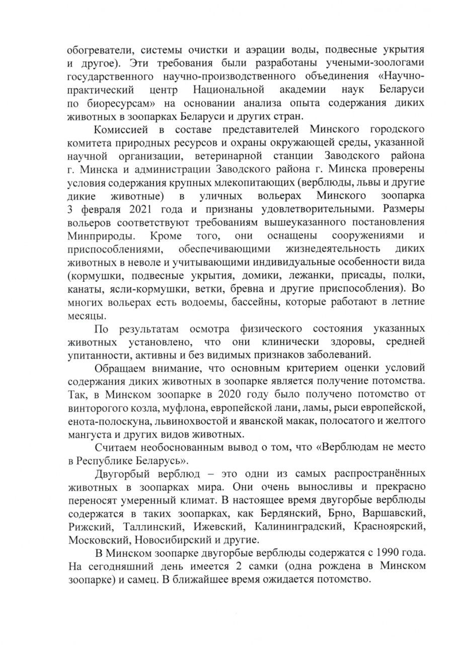 Некоторые заявители настоящего обращения, посетив по воле случая зоопарк в городе Минске, были шокированы условием содержания животных. Больно смотреть на то, какие животные худые и замученные. Воды мало, от солнца спрятаться негде, вольеры маленькие. Верблюдам точно не место в Республике Беларусь.
