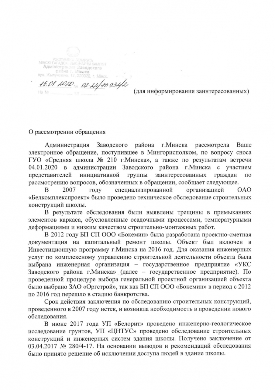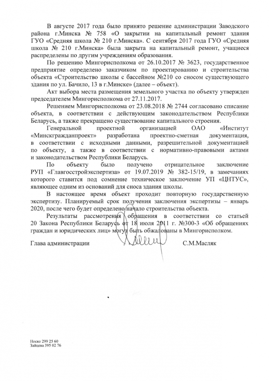 Руководствуясь ст.41 Закона "О местном управлении и самоуправлении в Республике Беларусь" которая определяет, что исполкомы в пределах своей компетенции в порядке, установленном законодательством, решают вопросы размещения объектов строительства на соответствующей территории, а также создают условия для реализации гражданами права на образование, требуем принять окончательное решение по вопросу сноса здания ГУО "Средняя школа №210 г.Минска", а также строительства новой школы в данном районе.