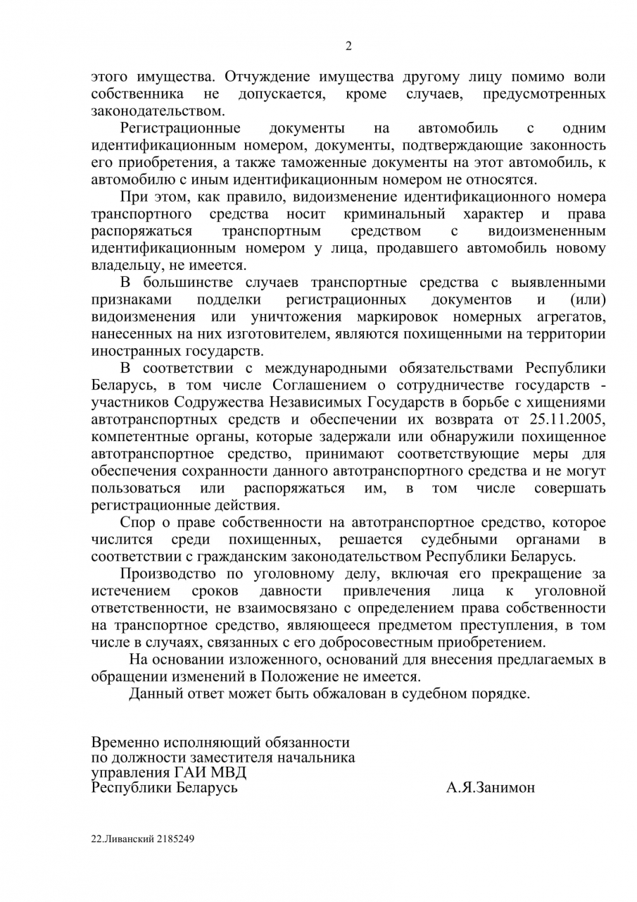 Необходимо внести изменения в Постановление Совмина от 31.12.2002 №1849 "Об утверждении Положения о порядке государственной регистрации и государственного учёта транспортных средств, снятия с учёта и внесения изменений в документы, связанные с регистрацией транспортных средств", предусматривающее постановку на учёт автомобилей, с умышленно видоизменённым номером номерных агрегатов (Vin- номер, шасси и иных) в случае установления законности его приобретения, после истечения сроков привлечения лица (установлено лицо или нет) к уголовной ответственности по уголовному делу. Так как в случае приобретения автомобиля с умышленным видоизменением номерного агрегата, многие граждане сталкиваются с проблемой невозможности, после указанных выше изменений, постановки автомобиля на учёт, являясь при этом добросовестными покупателями, в связи с чем, исключается возможность эксплуатации автомобиля.