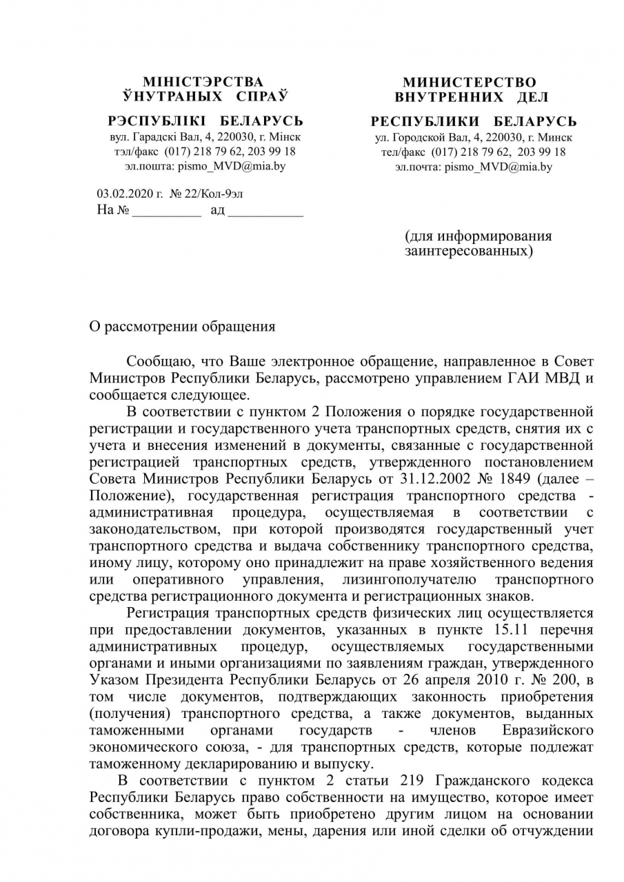 Оснований для внесения предлагаемых в обращении изменений в Положение Положения о порядке государственной регистрации и государственного учета транспортных средств, снятия их с учёта и внесения изменений в документы, связанные с государственной регистрацией транспортных средств (утв. Постановлением Совмина от 31.12.2002 № 1849) не имеется.